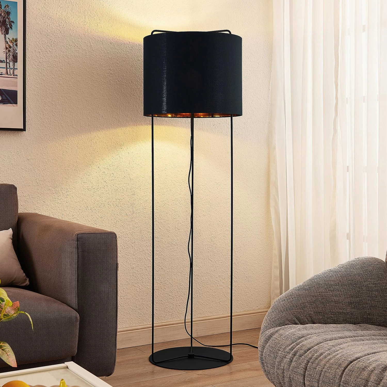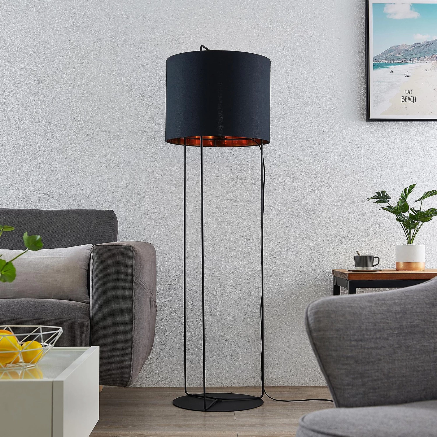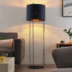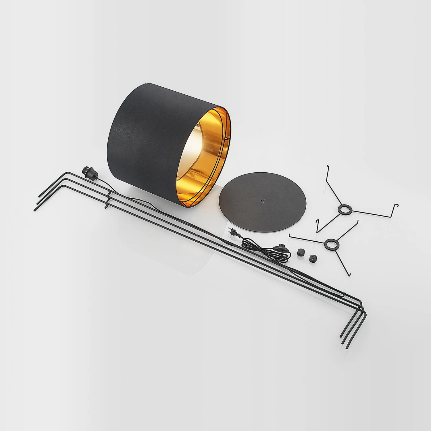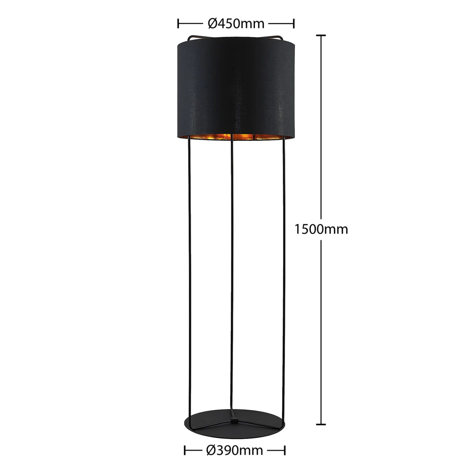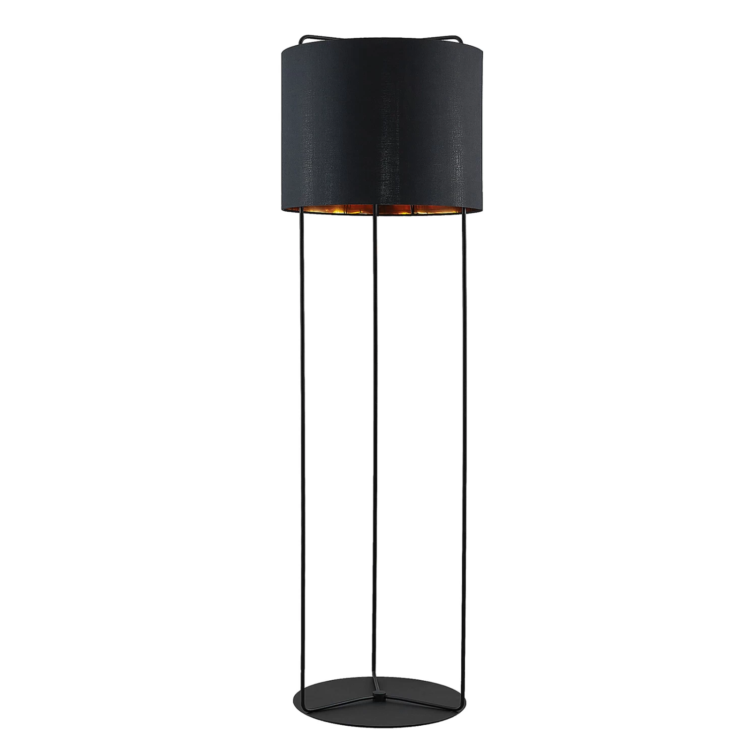 Edle Stehleuchte Kesta mit schwarz-goldenem Textilschirm und filigran gearbeitetem Gestell aus drei Stahlstreben