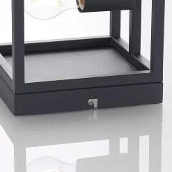 Dunkelgraue, eckige Wandleuchte Meron im Stil eines Käfigs Meron zählt zu den modernen Lichtspendern, die sich aber auch in einer Vintage-Umgebung durchaus sehen lassen können. Der Leuchtenkörper ist vollkommen geradlinig gestaltet worden und erinnert an einen Käfig. Die Seiten sind vollkommen frei, weil der Leuchtenschirm genau genommen nur aus Rahmenstreben besteht. Das hat zur Folge, dass dem Leuchtmittel wegen seiner großen Präsenz auch in puncto Optik eine besondere Rolle zukommt. Die Lampe sollte deshalb gut zum Gesamtlook passen und idealerweise im Glühlampenlook gehalten sein. Die metallene Oberfläche der Wandlampe ist mit einem dunkelgrauen Finish versehen worden, das für eine kühle, stilsichere Ausstrahlung steht.