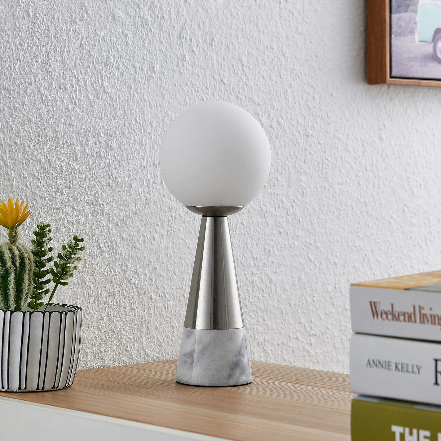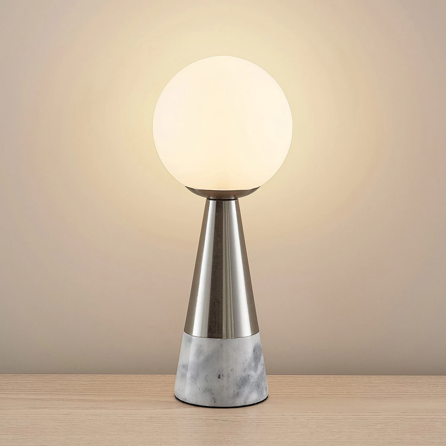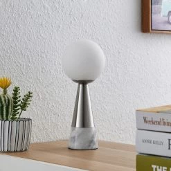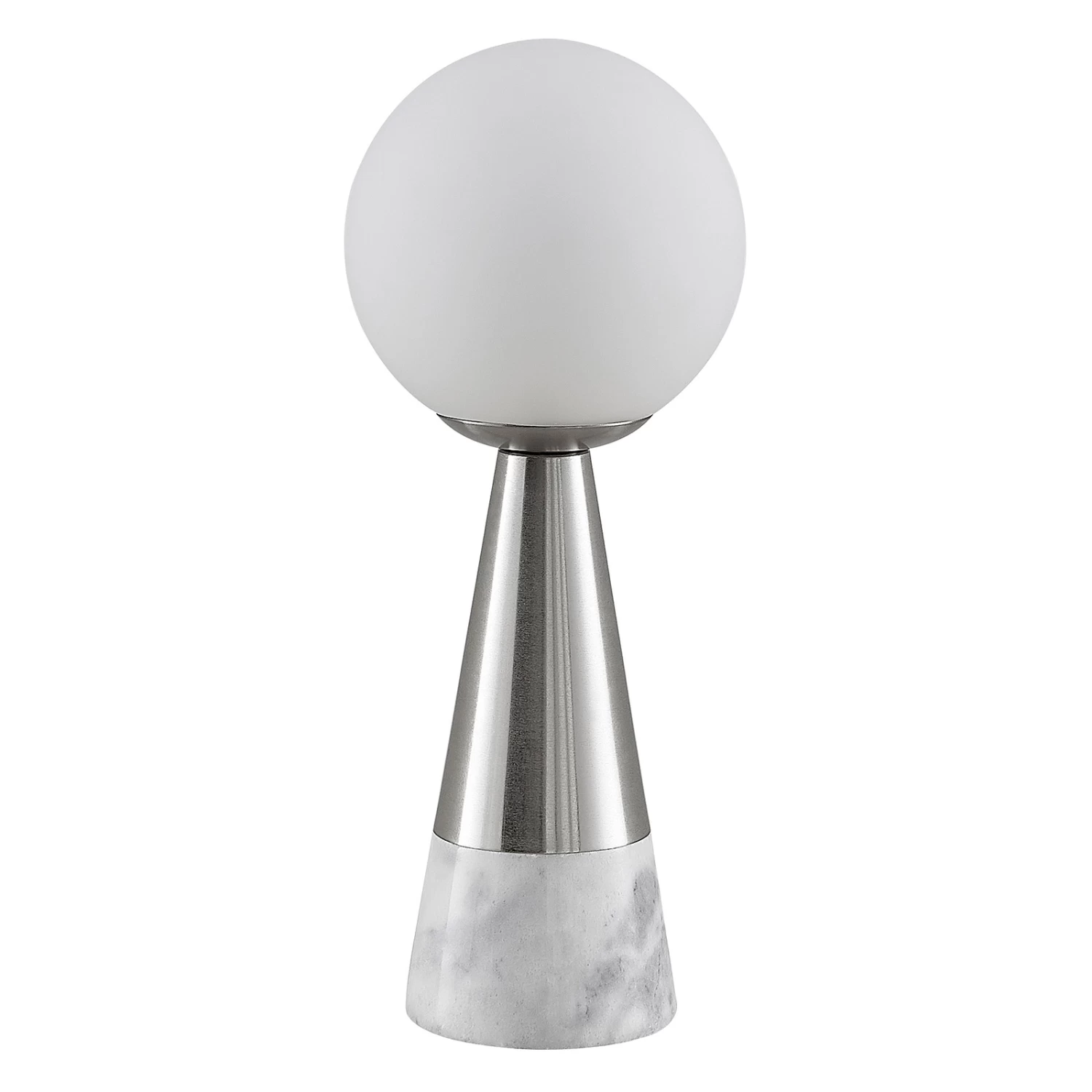 Filigrane Tischleuchte Noana in elegantem Design aus Marmor, Stahl in Nickelfinish und Opalglas
