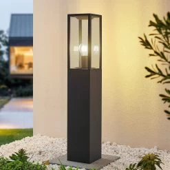Die Wegeleuchte Peldar spricht mit ihrem auffälligen Design ganz für sich. Sie ist ganz in Dunkelgrau gestaltet und hat eine eckige Bauform. Das Gestell besteht aus Aluminium und hat vier Glaseinsätze als Leuchtenschirm, sodass die Brennstelle von allen Seiten gut sichtbar bleibt.