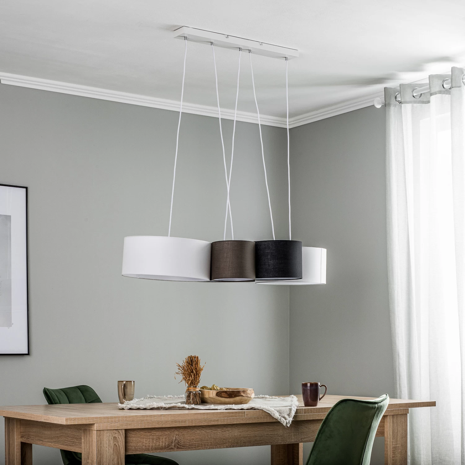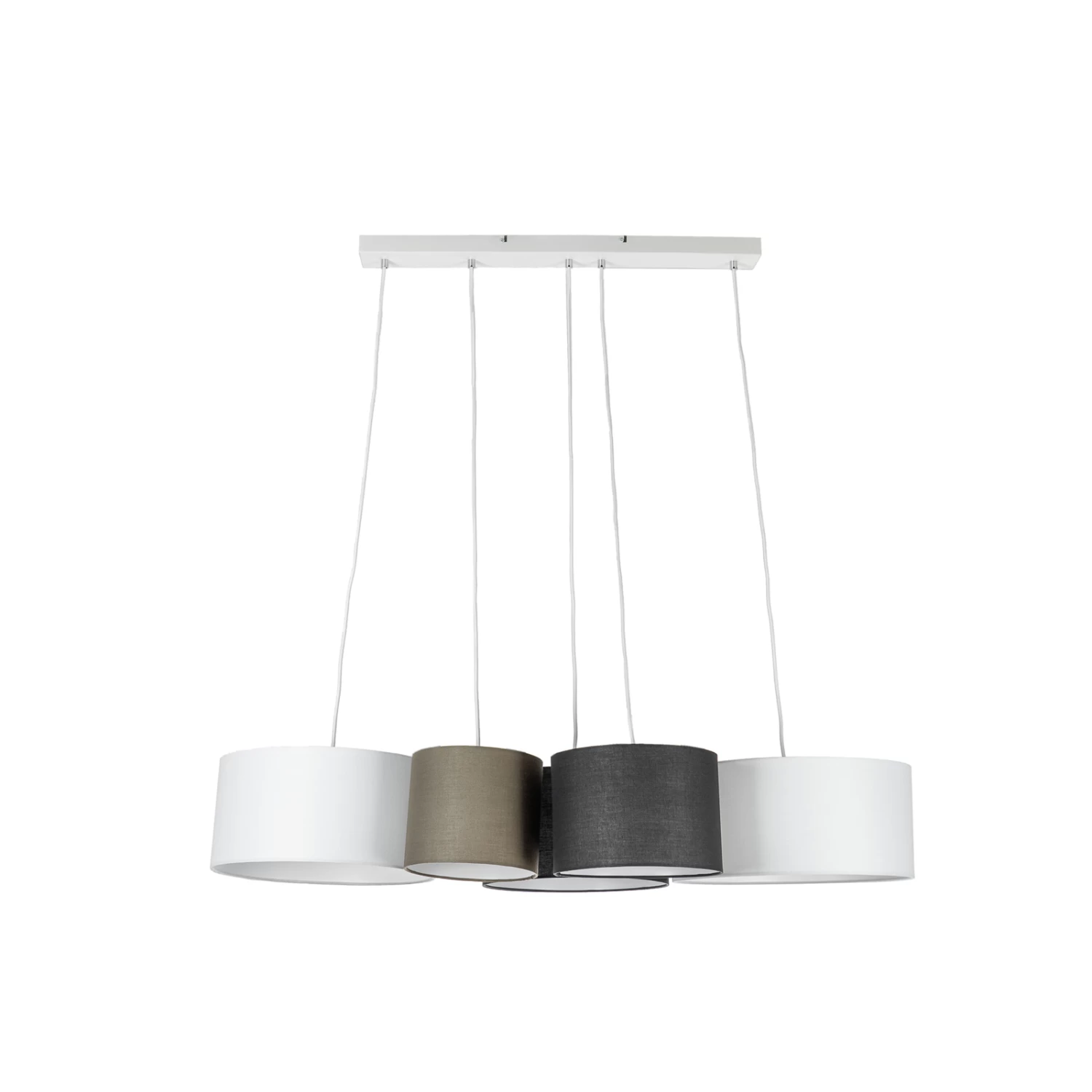 Vironi ist eine ganz besondere Pendelleuchte, die vor allem durch den eleganten Farbkontrast von Schwarz und Weiß hervorsticht. Ihre Leuchtenschirme stehen im Vordergrund des Designs und wurden abwechselnd in Schwarz, Weiß und Grau gestaltet. Außerdem besitzen sie unterschiedliche Größen, was den Look noch aufregender macht. So wird diese Hängeleuchte auch im ausgeschalteten Zustand zu einem echter Hingucker.