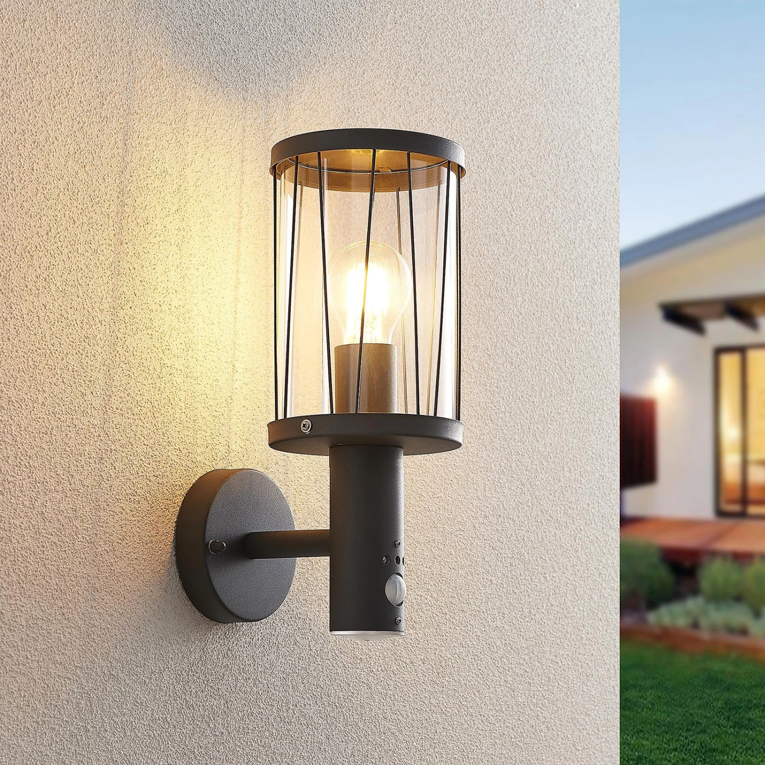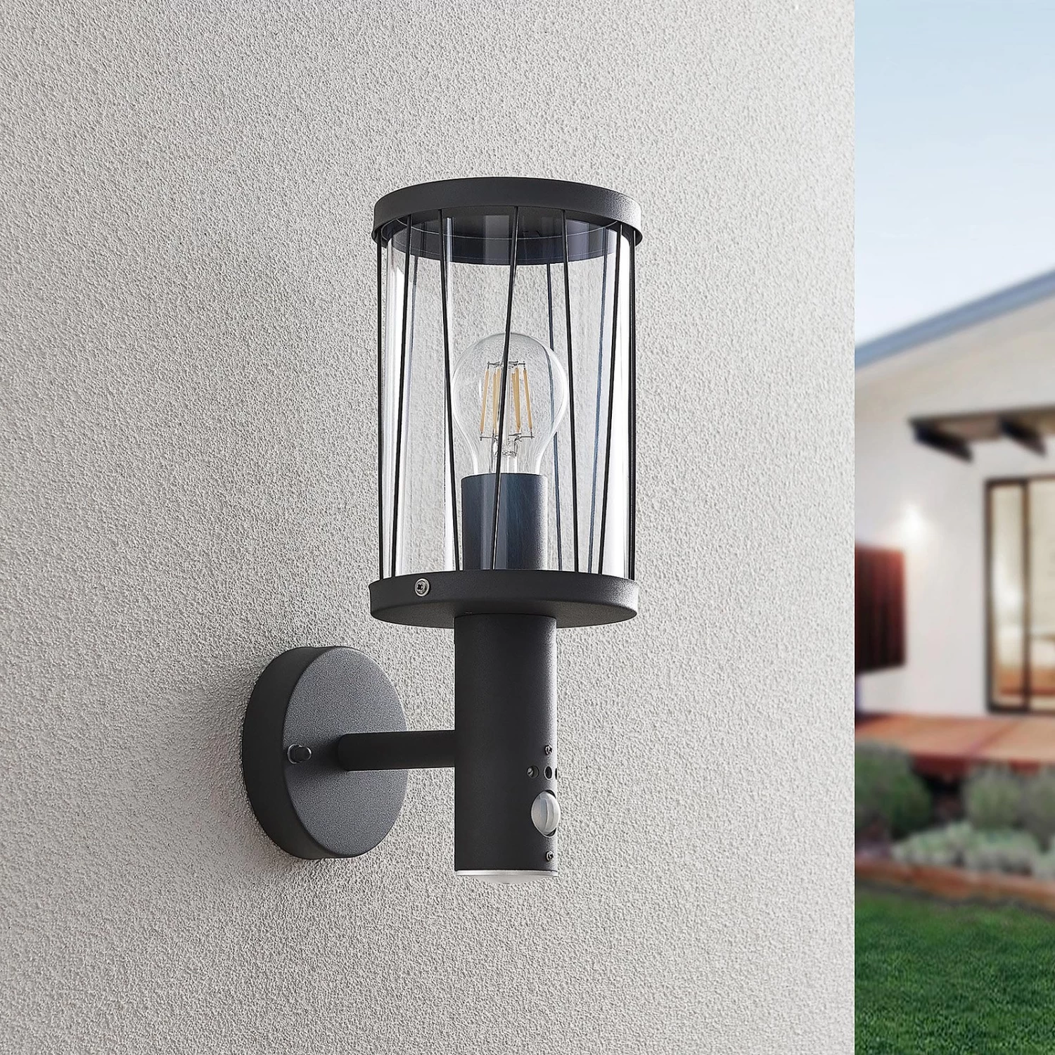 Bewegungsmelder-Außenwandlampe Yonan mit dekorativen Schrägstreben und Zylinderform