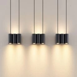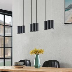 Jeder der auf der Suche nach einer aufsehenerregenden Hängelampe ist, wird durch Cesur nicht enttäuscht. Die Leuchte ist aus Stahl hergestellt und präsentiert sich in einem stimmigen Schwarz. Ihre längliche Deckenhalterung trägt drei Leuchtenschirme, die jeweils aus drei Röhren bestehen. Innerhalb dieser Röhren sitzt jeweils eine Fassung, die mit entsprechenden Leuchtmitteln bestückt werden kann. Hier können die Lichtintensität und die Lichtfarbe an die persönlichen Bedürfnisse angepasst werden, in dem man zu einem Leuchtmittel nach Wahl greift. Die Hängeleuchte Cesur eignet sich hervorragend für die Installation in einem Wohnzimmer oder einem Esszimmer.