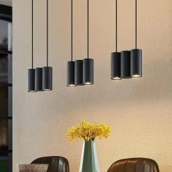 Jeder der auf der Suche nach einer aufsehenerregenden Hängelampe ist, wird durch Cesur nicht enttäuscht. Die Leuchte ist aus Stahl hergestellt und präsentiert sich in einem stimmigen Schwarz. Ihre längliche Deckenhalterung trägt drei Leuchtenschirme, die jeweils aus drei Röhren bestehen. Innerhalb dieser Röhren sitzt jeweils eine Fassung, die mit entsprechenden Leuchtmitteln bestückt werden kann. Hier können die Lichtintensität und die Lichtfarbe an die persönlichen Bedürfnisse angepasst werden, in dem man zu einem Leuchtmittel nach Wahl greift. Die Hängeleuchte Cesur eignet sich hervorragend für die Installation in einem Wohnzimmer oder einem Esszimmer.