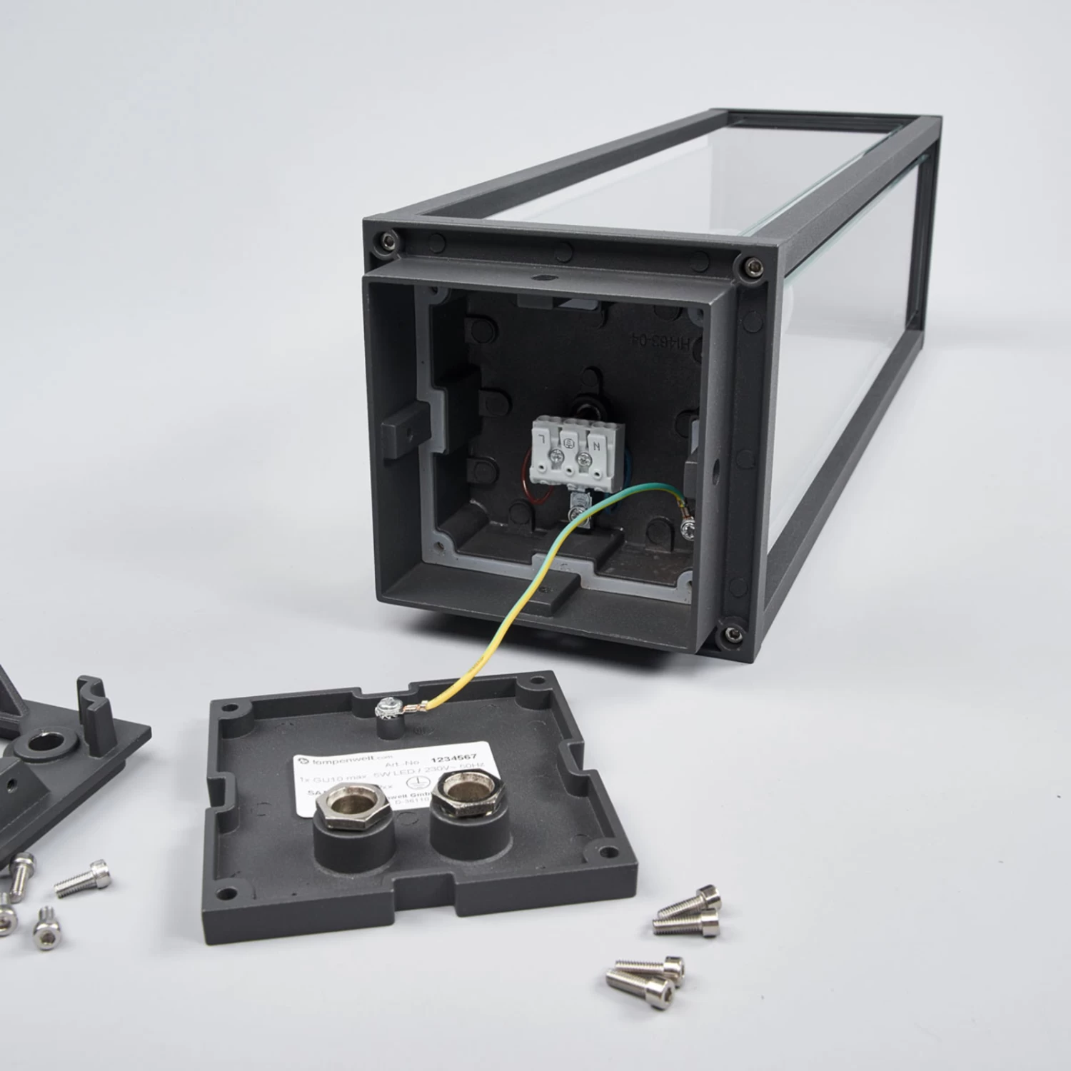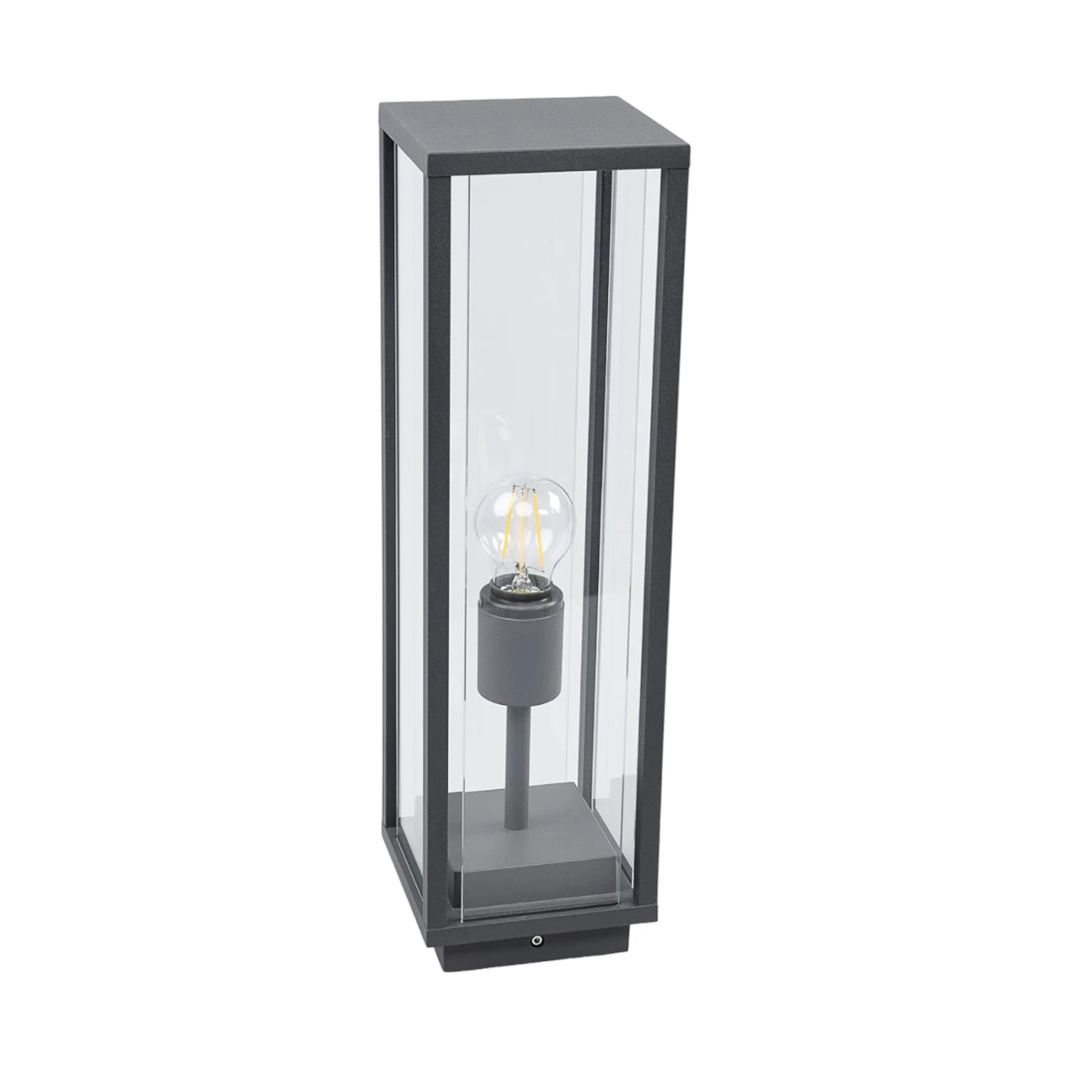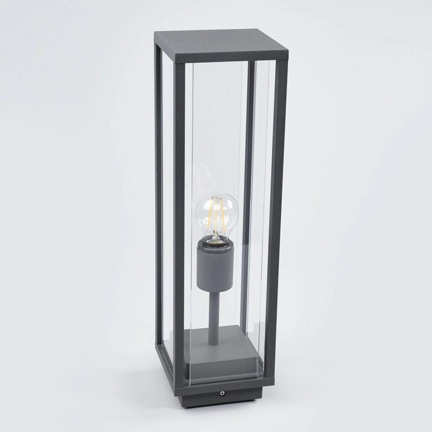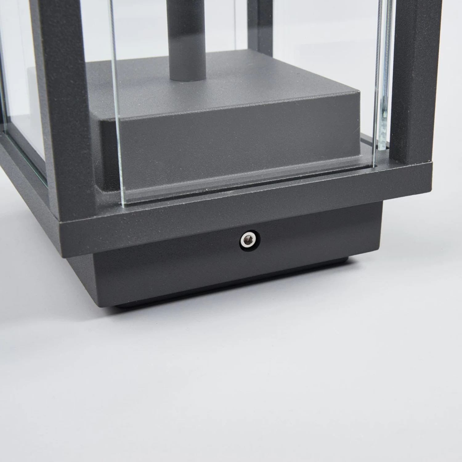 Das dunkelgraue Gestell aus Aluminium ist in eckiger Form gehalten und erscheint aus diesem Grund sehr modern. Glaseinsätze mit klarer Oberfläche ergänzen die Metallelemente und sorgen für einen klaren Durchblick, so dass nichts von der Leuchtkraft der verwendeten Lampe verloren geht.