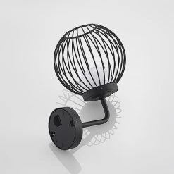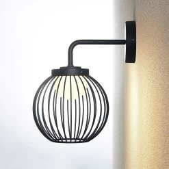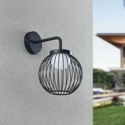 Käfigförmige LED-Außenwandleuchte Kartivan in Kugelform, IP65Eine weiße Kugel sorgt hier für eine weiche Verteilung des LED-Lichts, das diese Außenwandleuchte generiert. Darum fügt sich eine größere Kugel aus Metall, die mit den schmalen Streben wie ein Käfig aussieht und entsprechend wirkungsvoll mit ihrer Optik begeistert. Dank der LEDs wird zudem ein energiesparendes Licht im Außenbereich erzeugt und die hohe Schutzart verspricht bestens Schutz vor Wind und Wetter, so dass die Leuchte draußen bedenkenlos verwendet werden kann und als besonders robust gilt.