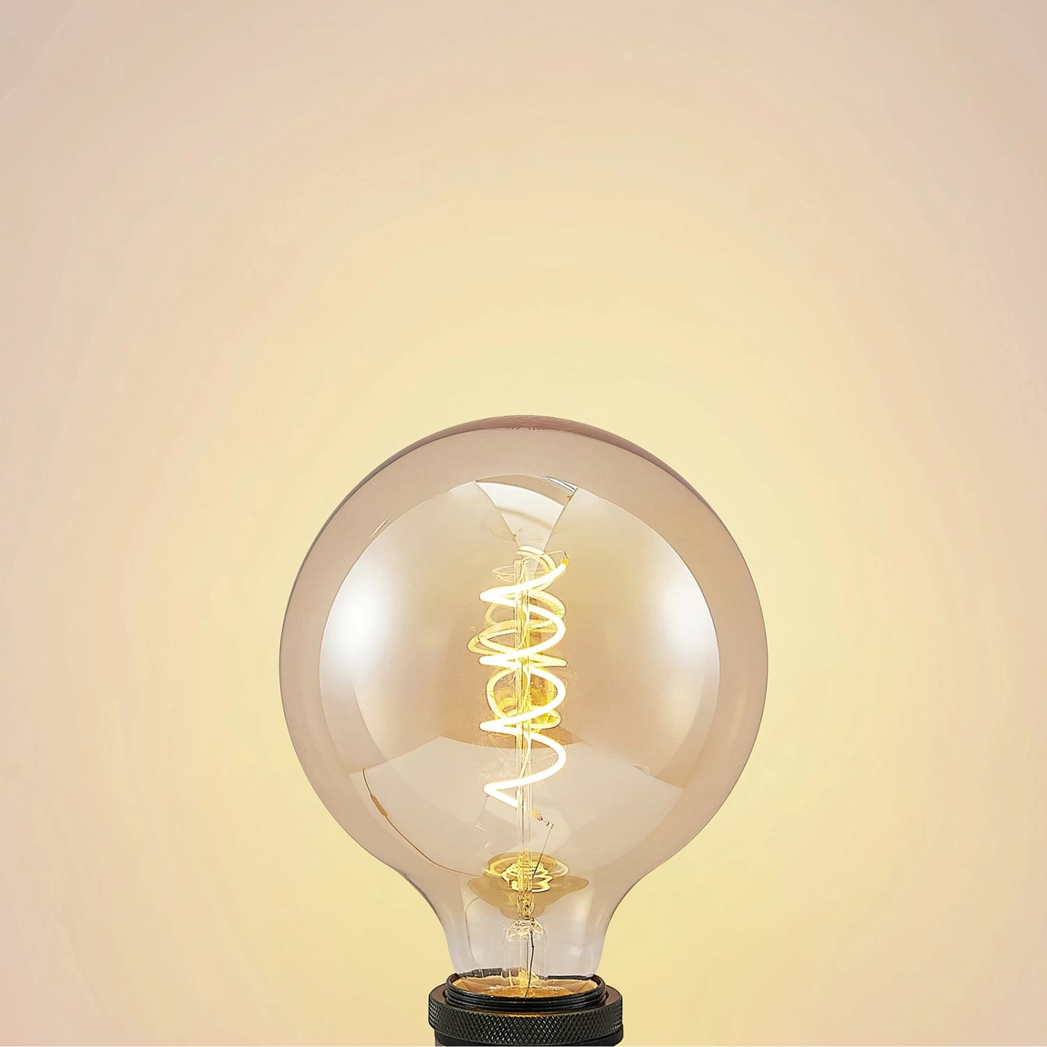 Mit ihrer stromsparenden Leistung von 4 Watt kann diese E27-LED-Globelampe eine gewöhnliche Glühbirne von bis zu 18 Watt ersetzen. Mit ihrer amberfarbenen Oberfläche wirkt sie sehr dekorativ. Der Filamentstab schwingt sich spiralförmig nach oben und verleiht der Lampe einen besonderen Look, der sich vor allem in Beleuchtungsobjekten mit einem offenen Leuchtenschirm sehen lassen kann. Bei Bedarf lässt sich die Lampe dimmen, sodass die Raumatmosphäre individuell angepasst werden kann. Die Farbwiedergabe ist mit dem hohen CRI von über 90 besonders gut.