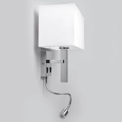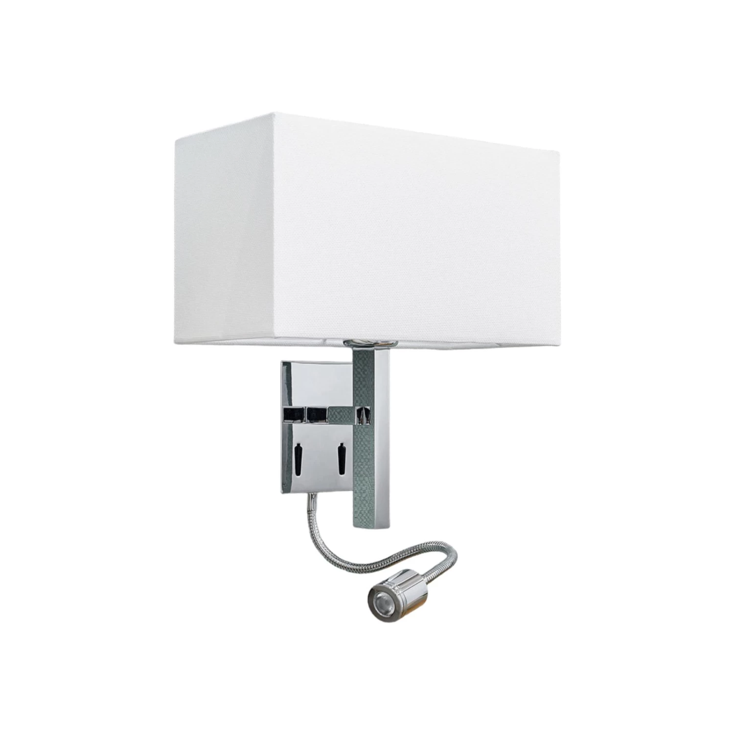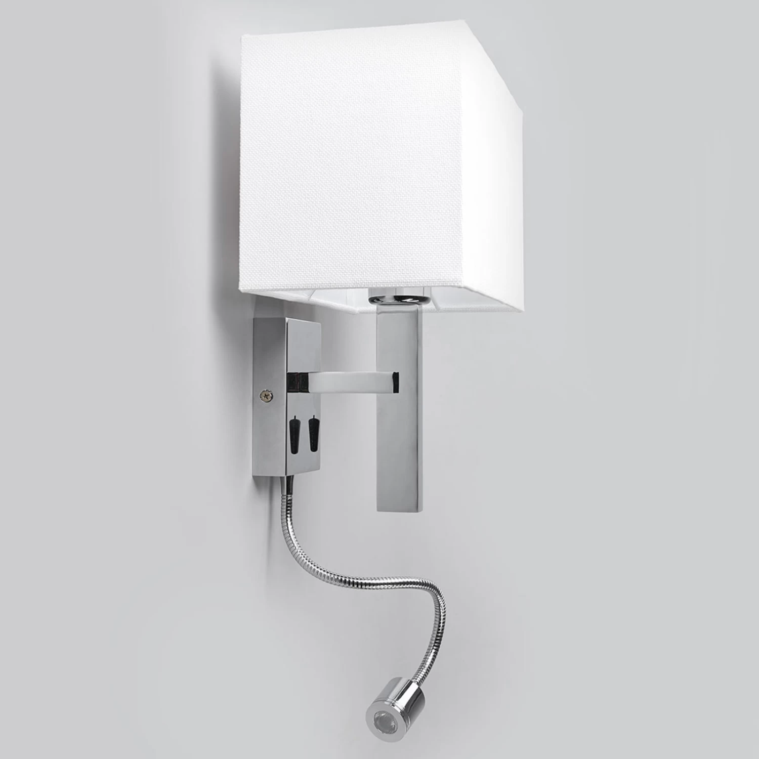 Pelto ist eine Wandleuchte, die sowohl im privaten Bereich als auch in Hotelzimmern Verwendung finden kann. Der Schirm besteht aus Stoff, ist eckig und hat eine weiße Oberfläche, so dass der Lichtschein warm und weich nach außen dringt. Als zweite Lichtquelle wurde eine LED-Leselampe integriert, die über einen Flexarm mit dem verchromten Gestell verbunden ist und beliebig in alle Richtungen gedreht werden kann. Zwei Schalter ermöglichen ein unabhängiges Ein- und Ausschalten der beiden unterschiedlichen Lichtquellen, die verschiedenen Funktionen gerecht werden.