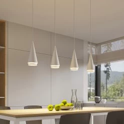 Naoh überzeugt im wahrsten Sinne des Worte auf ganzer Linie, denn die Pendelleuchte ist in länglicher, linienförmiger Form gestaltet und passt damit hervorragend über einen Tisch, wo sie als Essplatzbeleuchtung dienen kann. Wegen der Metallschirme wird der Lichtschein ausschließlich nach unten abgegeben und illuminiert die Fläche hell und gebündelt, während die Raumbeleuchtung durch Blendfreiheit gekennzeichnet ist. Die Kegel wirken stilvoll und sind besonders individuell gestaltet, weil sie eine zweilagige Form besitzen.