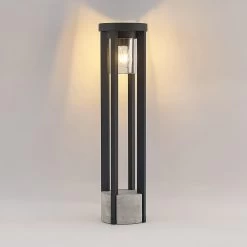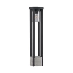 Die Wegeleuchte Overa überrascht mit einem besonderen Design und einer gelungenen Kombination aus unterschiedlichen Materialien. Das Gehäuse wurde gänzlich aus Aluminium hergestellt und mit einem dunkelgrauen Oberflächenfinish überzogen. Der Sockel der Leuchte besteht aus Zement und sorgt dafür, dass Overa stabil auf dem Boden steht.