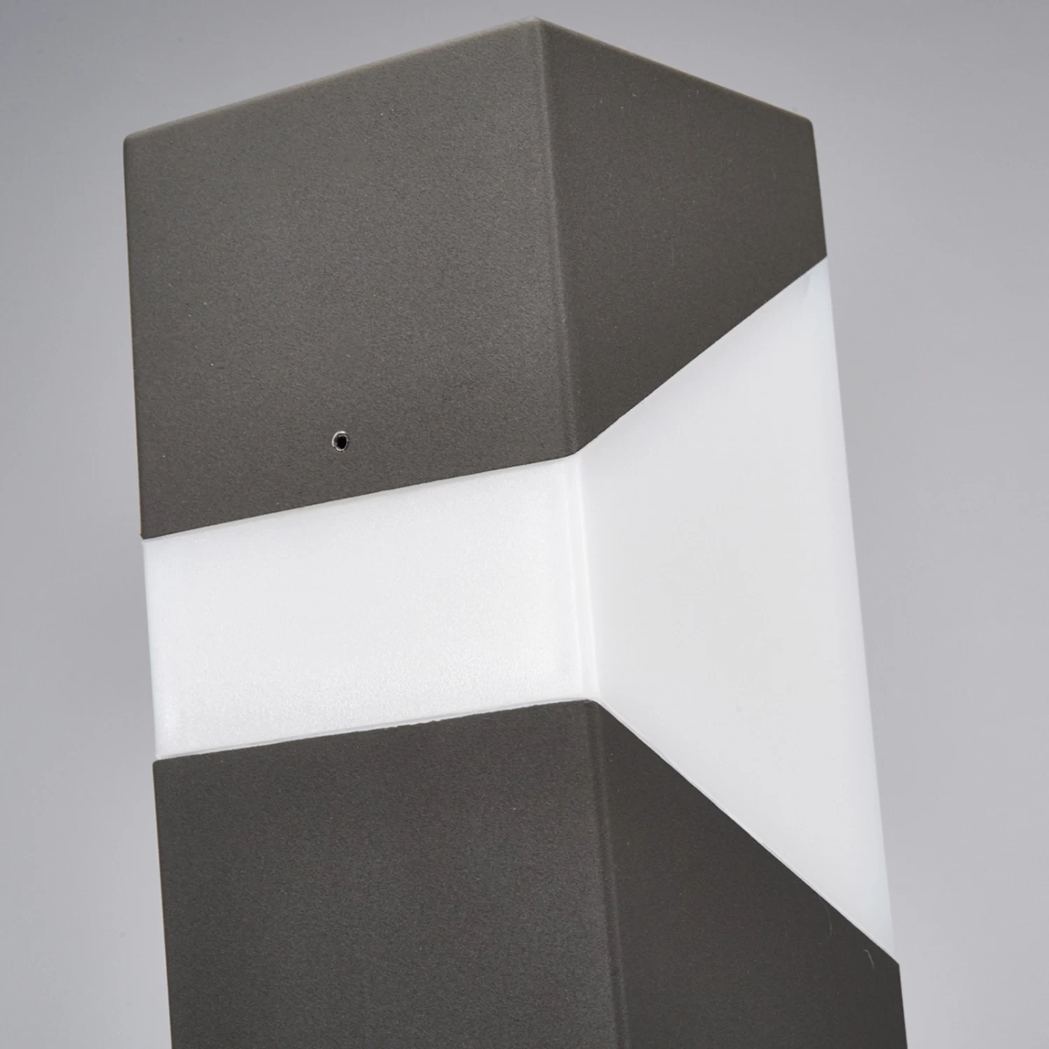 Aluminium-Sockelleuchte Kiran mit integriertem Bewegungsmelder Man erkennt es bereits beim ersten Blick: Die Linie ist das formgebende Merkmal dieser modern erscheinenden Sockelleuchte aus Aluminium. Der Leuchtenkörper präsentiert sich ausschließlich kantig, Wölbungen scheint man vergeblich zu suchen. Diese Optik ist das, was die Sockelleuchte für modern gestaltete Hausumgebungen und Zufahrtswege empfiehlt. Als besonderes Detail kann der weiße Polycarbonatdiffusor gewertet werden, der seitlich in Form eines Dreiecks oder – wenn man genau hinschaut – eigentlich in Trapezform in die Leuchte eingelassen ist und für ein kontrastreiches, aber dennoch harmonisches Erscheinungsbild sorgt. Der integrierte Bewegungsmelder bedeutet ein Plus an Funktionalität und Komfort, denn durch ihn schaltet sich das Licht immer dann ein, wenn es benötigt wird, und das Gefühl, im Dunkeln zu stehen, gehört somit der Vergangenheit an. – Erfassungswinkel: 120° – Reichweite: max. 9 m – Leuchtzeit einstellbar von 5 Sekunden bis 8 Minuten
