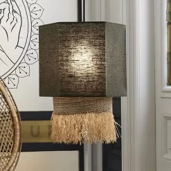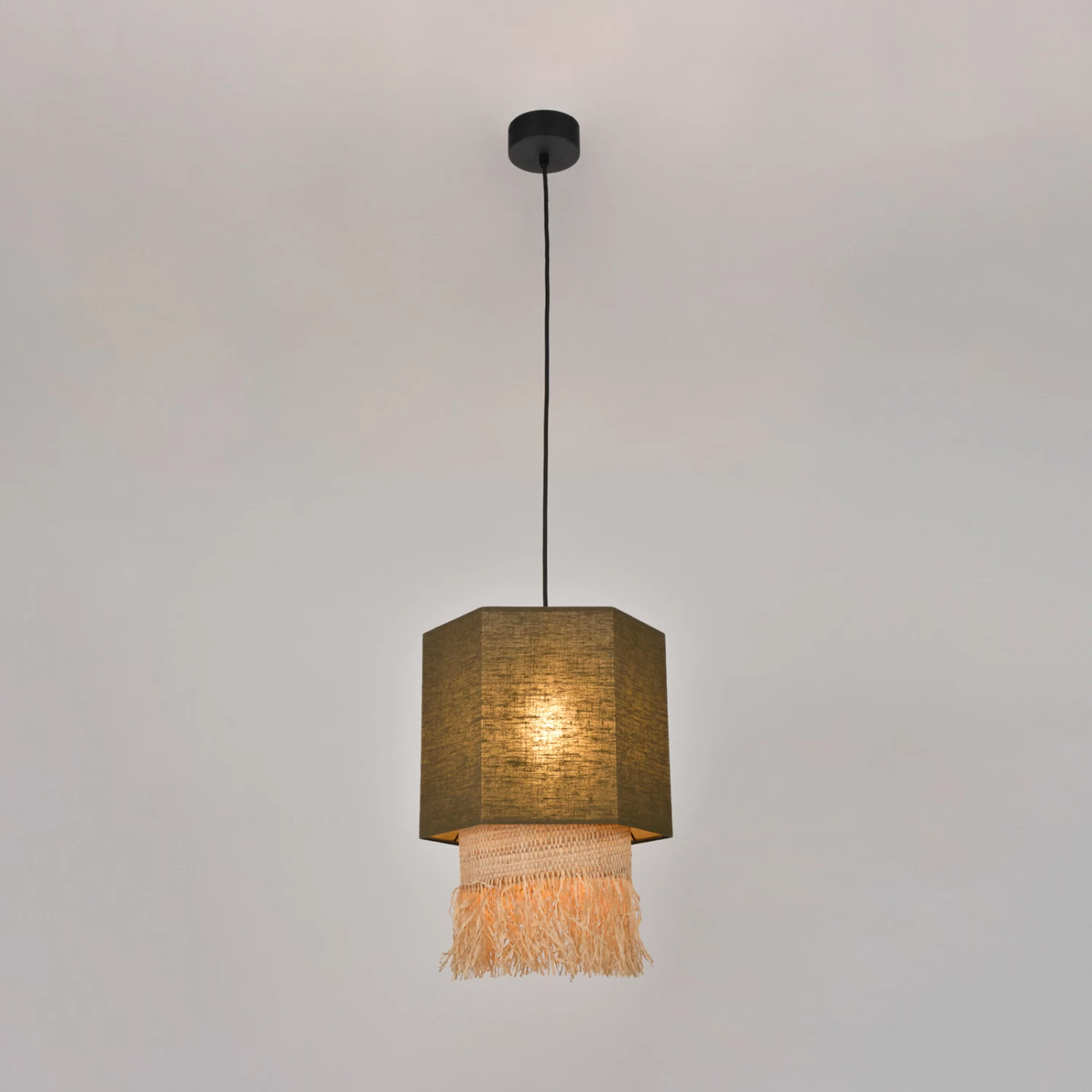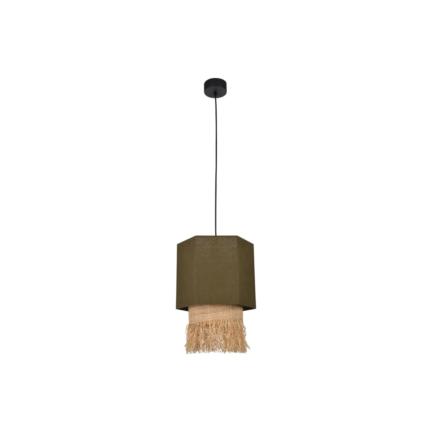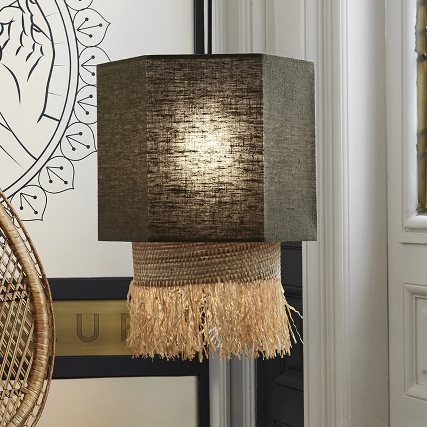 Der wohnliche Charakter eines klassischen Stoffschirms wird bei der Hängeleuchte Marrakech des französischen Design-Labels MARKET SET mit einer Noto Boho Chic kombiniert. Der vertikal offene Außenschirm aus farbigem Leinentextil ist in sechseckiger Form gestaltet. Hinzu kommt ein zylindrischer Innenschirm aus naturbeigen Fasern der Bananenstaude und Raffiapalme. Der untere Rand kommt im lässigen Fransenlook daher. Das mit Textil ummantelte Kabel und der runde Baldachin aus Metall sind in Schwarz gehalten.
