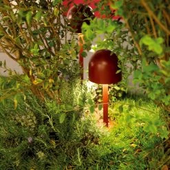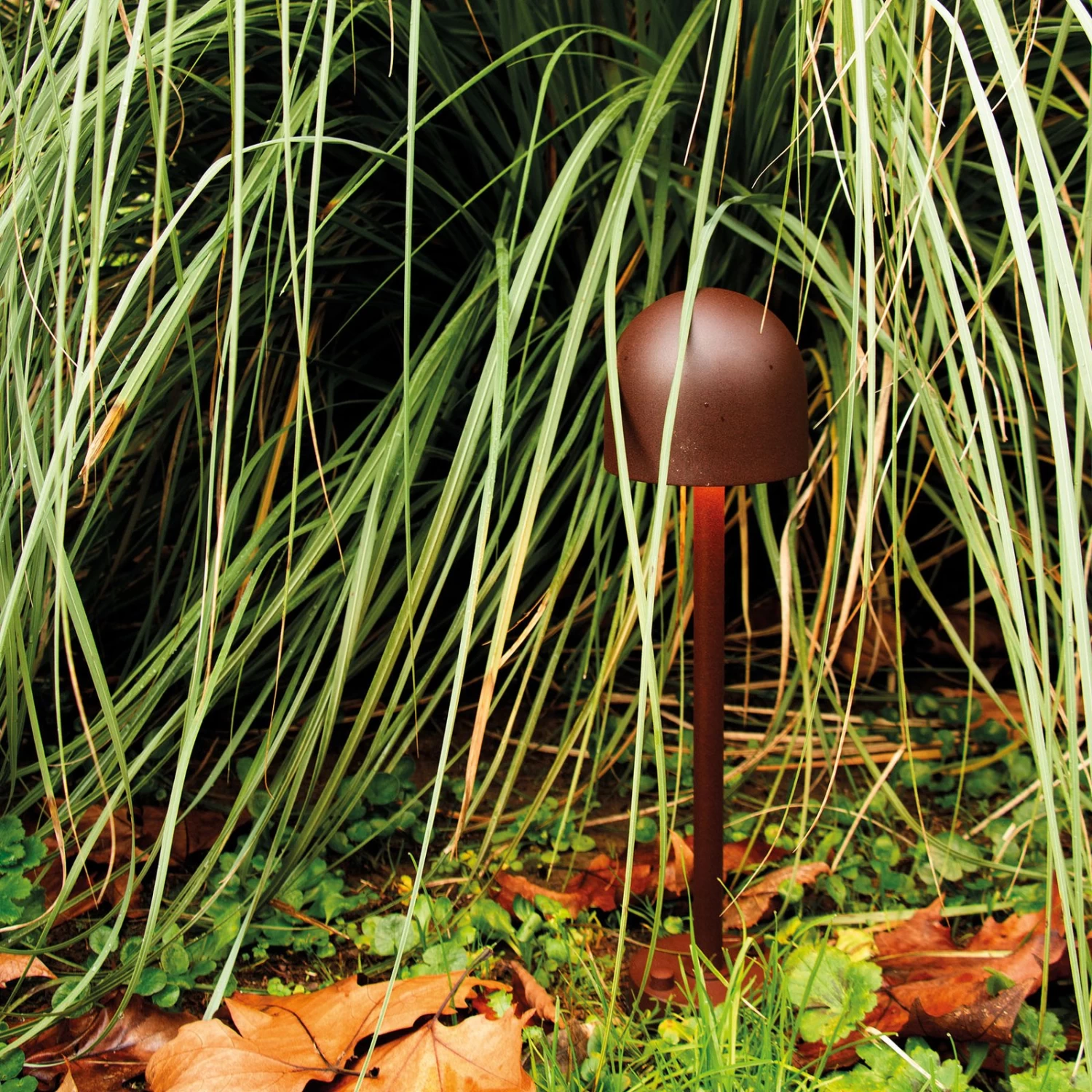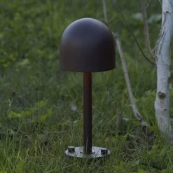 Diese Sockelleuchte bereichert die Außenanlage nicht nur mit angenehmem Licht, sondern fügt sich mit ihrer Gestaltung auch hervorragend in die Umgebung ein. Die Formgebung ist von einem Steinpilz inspiriert, dessen Stiel, halbrunder Hut und rostbraune Farbgebung sich in der Sockelleuchte wiederfinden. Damit harmoniert Boleto sehr gut mit Grünanlagen. Zugleich wirken die Schraubenköpfe am Fuß und das Finish in Kortenstahl-Optik auch industriell. Die LEDs sind innerhalb des unten offenen Schirms hinter einer opalen Polycarbonat-Abdeckung angebracht und geben das Licht diffus auf den umliegenden Untergrund ab, sodass eine unaufdringliche und blendfreie, indirekte Lichtwirkung erzielt wird.