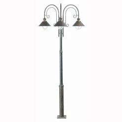 Diese Mastleuchte verzaubert jeden Außenbereich mit Stil und Eleganz. Die gebogene Form mit der inneren Verzierung dominiert das Design dieser Mastleuchte. Das große Klarglas mit Querverstrebungen vollendet die Formschönheit. Die Leuchte gehört zu einer Serie von Leuchten mit anmutigem Stil, die in kunsthandwerklicher Art und Weise hergestellt werden und durch ihr dekoratives Design und ihr angenehmes Wohlfühllicht überzeugen.