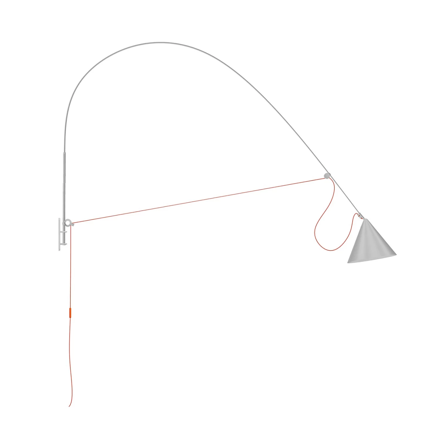Ein Fiberglas-Stab bildet das Kernelement, welches die charakteristische Anpassung der Leuchtenserie AYNO von einer geraden zu einer gebogenen Form ermöglicht. Das Textilkabel verläuft durch zwei Verstellringe, deren Verschieben die Länge des dazwischen verlaufenden Kabelabschnitts ändert und so den Fiberglas-Ausleger nach unten neigt. Zudem lässt sich der kegelförmige Schirm, der aus recyceltem Polycarbonat/ABS-Kunststoff gearbeitet ist, schwenken. Hier liegt hinter einem strukturiertem Diffusor ein hochwertiges LED-Modul, dessen Licht eine hervorragende Farbwiedergabe gewährleistet (CRI ≥ 95) und bei Defekt dank eines Bajonettverschlusses werkzeugfrei entnommen werden kann. Die Struktur, bestehend aus einer minimalistischen Wandbefestigung und einem senkrechten Gestellarm, besteht aus Stahl.