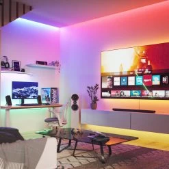 Schaffen Sie eine atemberaubende Hintergrundbeleuchtung in jedem Raum mit dem Nanoleaf Matter-fähigen intelligenten LED-Lichtstreifen Matter Lightstrip mit Farbwechsel. Dieser wird mit einem beigefügten Controller geliefert. Für die Steuerung direkt mit der kostenlosen Nanoleaf App ist lediglich ein Bluetooth-fähiges Smartphone oder Tablet erforderlich.