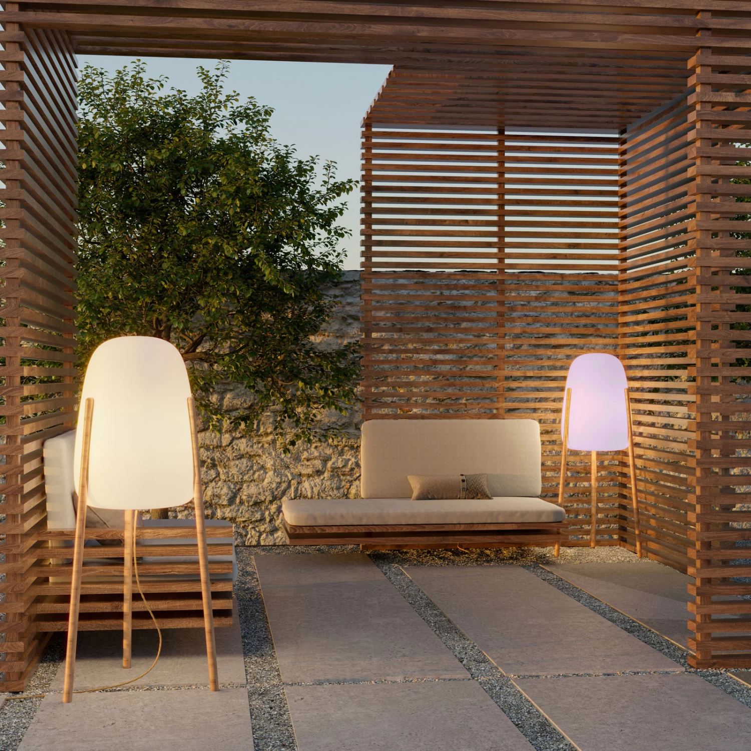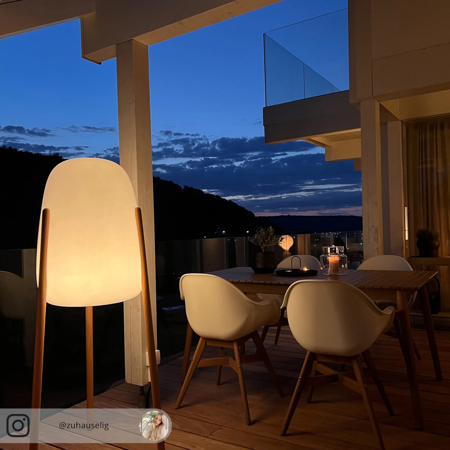 Rocket ist eine LED-Stehleuchte mit Akku, die aufgrund ihrer Gestaltung mit langem Schirm und drei daran befestigten Holzfüßen tatsächlich ein wenig an eine Rakete erinnert. Doch nicht nur die Optik macht sie zum interessanten Beleuchtungsaccessoire für den Außenbereich, auch die flexibel einstellbare Beleuchtung und die Nutzung ganz ohne ein störendes Kabel. Oben im Schirm wurde ein Solarpanel verbaut, das den integrierten Akku im Sonnenlicht auflädt. Alternativ lässt sich die Leuchte auch über ein Kabel am Stromnetz aufladen. Vollkommen unabhängig von einem Stromanschluss leuchtet sie wahlweise ab Einbruch der Dunkelheit oder sobald sie manuell eingeschaltet wird für die Dauer von 2 bis 20 Stunden (je nach Lichteinstellung und Akkuladung). Über die im Lieferumfang enthaltene Fernbedienung lässt sich nicht nur die Lichtfarbe auswählen, sondern auch die Helligkeit regulieren. Zur Auswahl steht farbige Beleuchtung aus einem großen Farbspektrum oder warmweiße Beleuchtung.