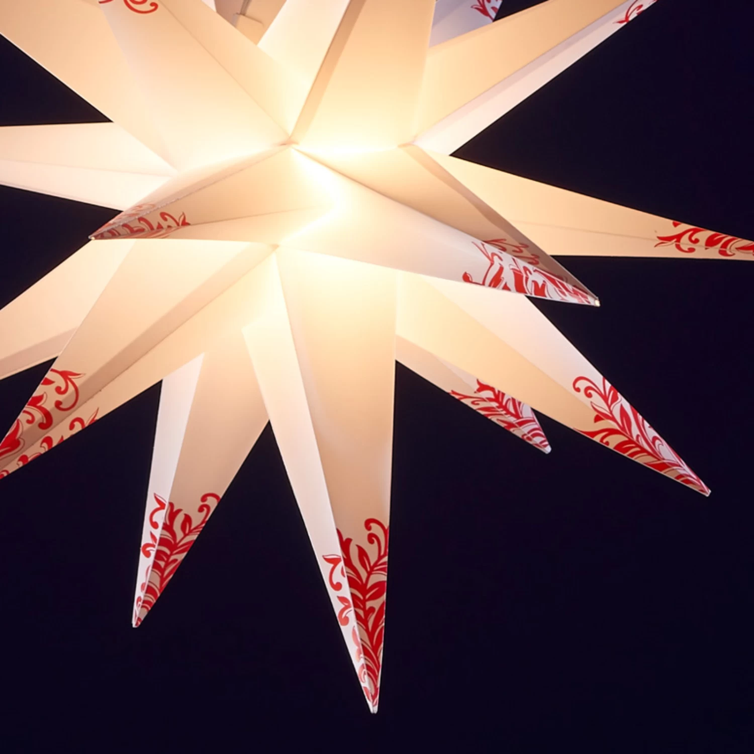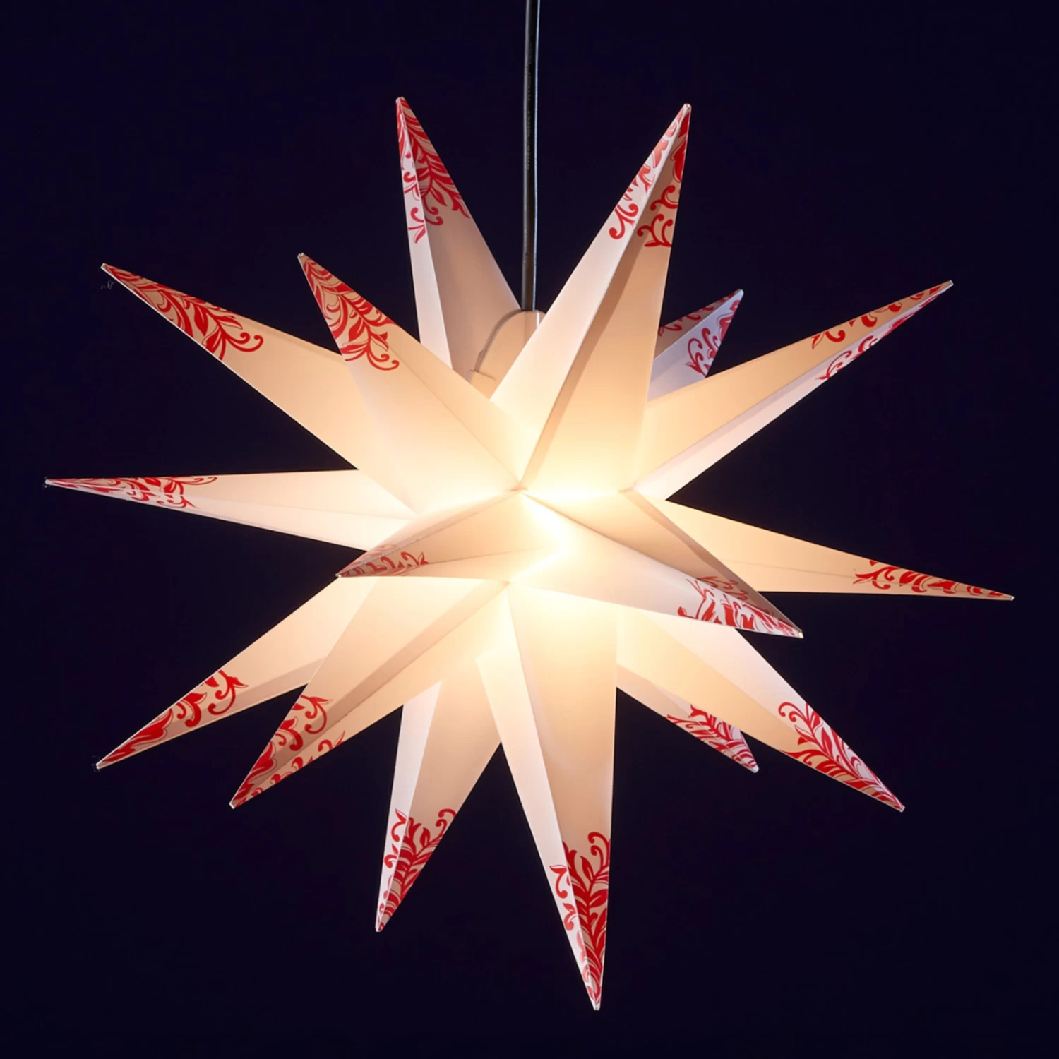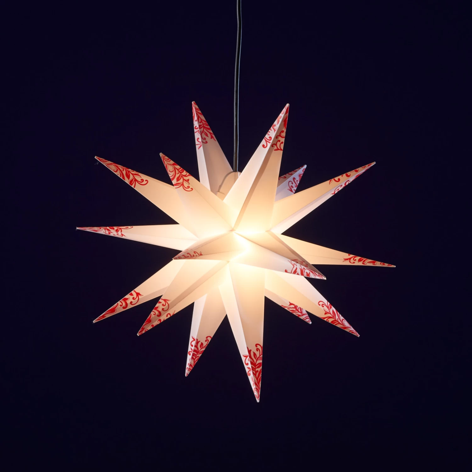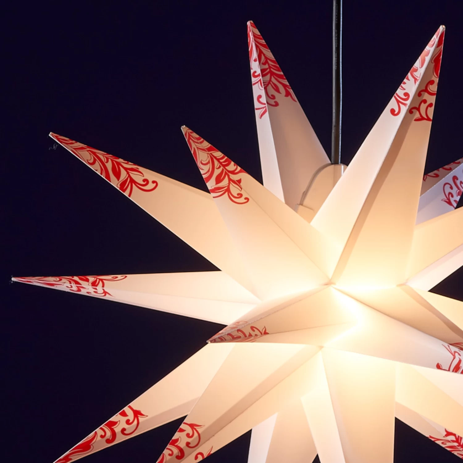 Dieser auffällige Stern aus Kunststoff mit dem roten Ornamentmuster an den Spitzen schmückt jeden Außenbereich in der Advents- und Weihnachtszeit. Er ist mit Schutzart IP44 ausgerüstet und hält somit auch stärkeren Witterungseinflüssen stand. Der Stern hat einen Durchmesser von 50 cm. Ein Stromkabel für den Außenbereich (400 cm) ist im Lieferumfang enthalten.