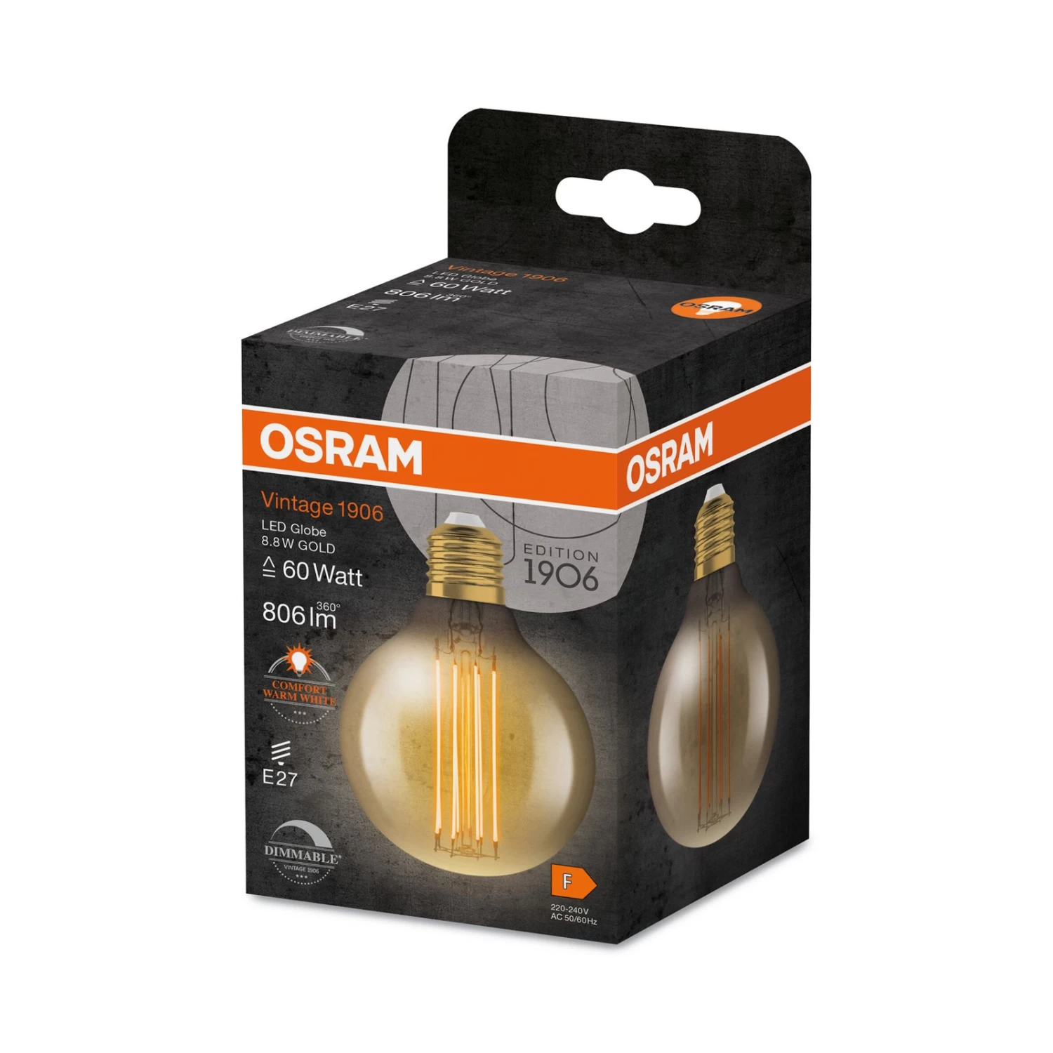OSRAM Vintage 1906, Filament-Globelampe E27 mit 8,8 W und besonders warmer Lichtfarbe (2.200 K), gold getönt