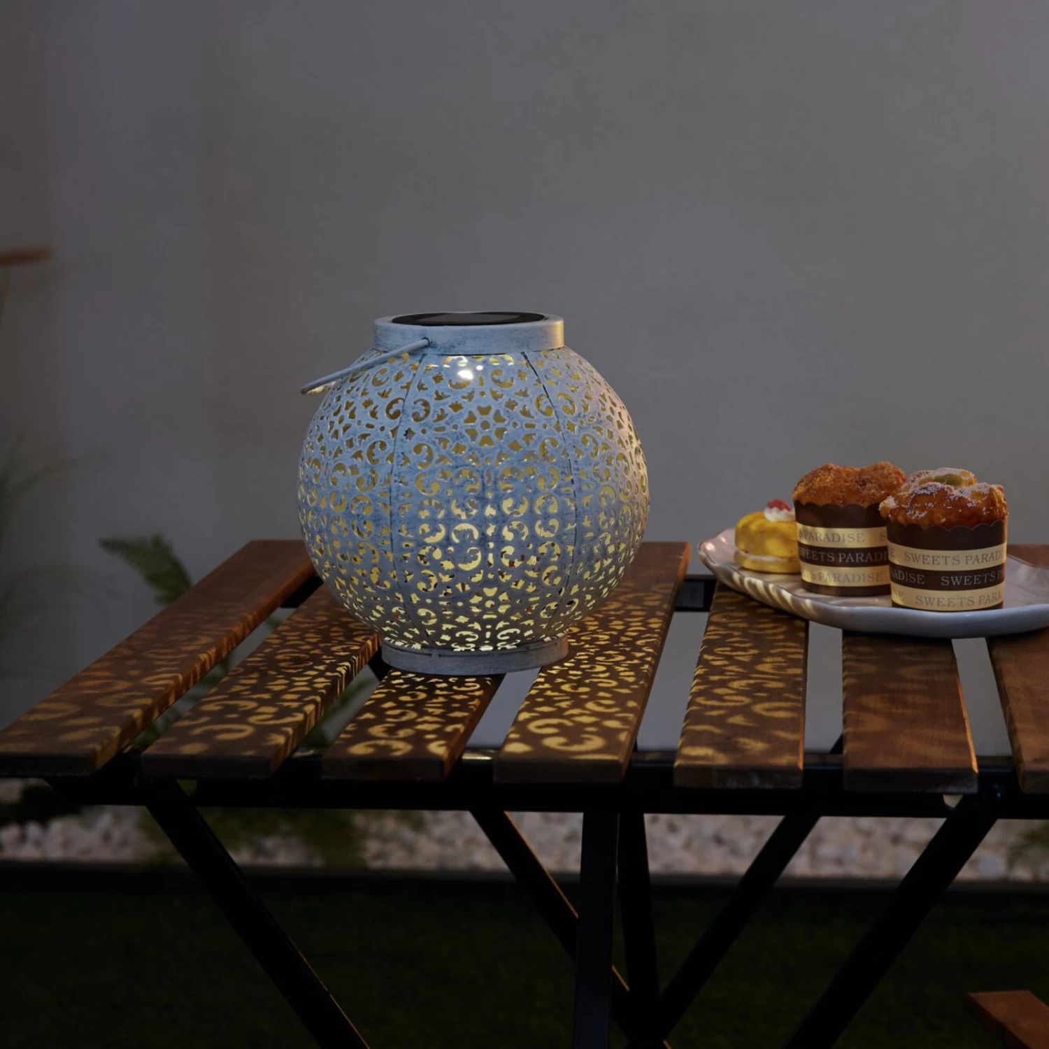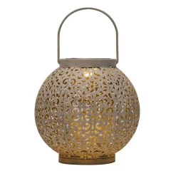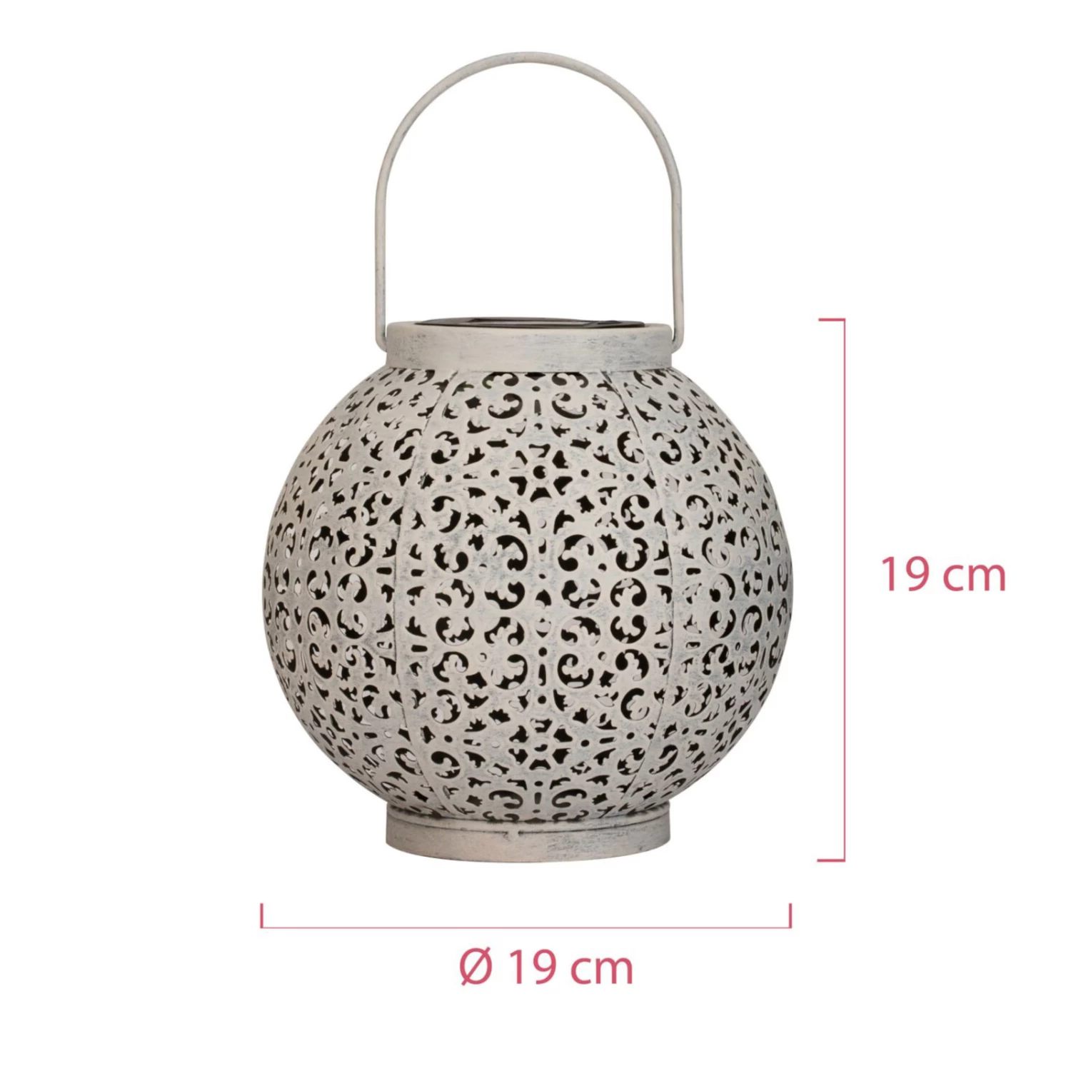Die Solar-Laterne Sunshine Jewel mit ihrer weißen Vintage-Oberfläche zaubert romantische Lichteffekte in den Außenbereich. Das Solarpanel lädt sich tagsüber im Sonnenlicht auf und wird abends automatisch eingeschaltet. Der inkludierte Akku bietet eine Leuchtdauer von bis zu 8 Stunden täglich. Die goldene Innenbeschichtung des Metallkonstrukts lässt das Licht besonders warm wirken. Mit dem Henkel lässt sich die Leuchte auch in Bäumen oder an Überdächern anbringen.