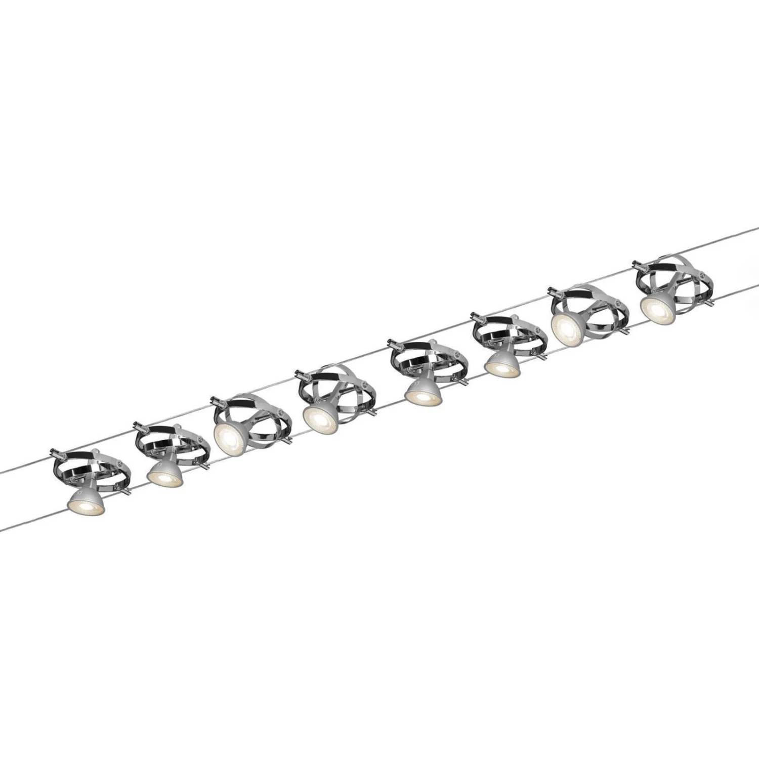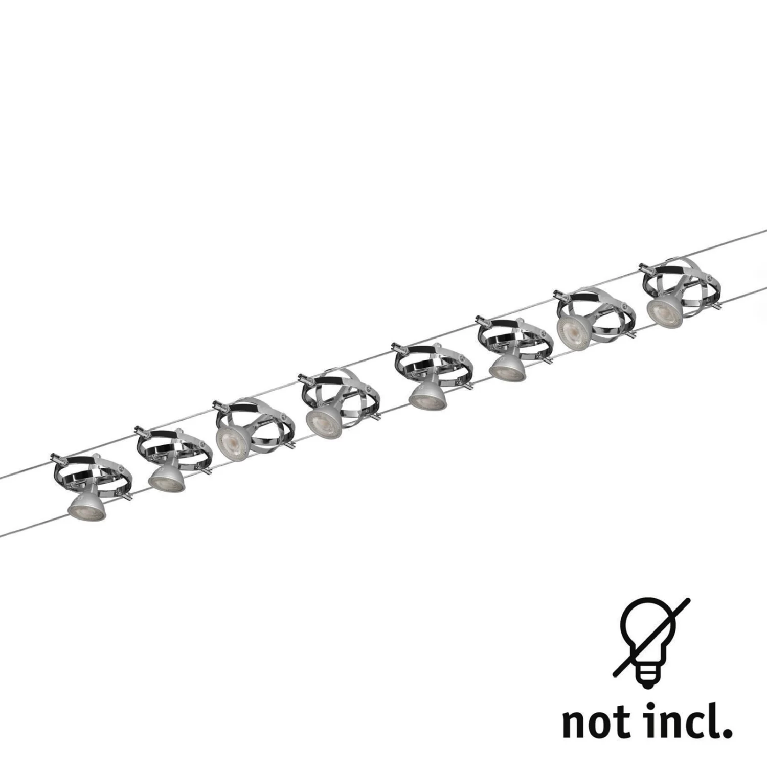 Auch große Räume lassen sich mit dem achtflammigen Seilsystem Cardan beleuchten. Die Leuchten des Seilsystems bestehen aus zwei schmalen Metallringen, die eine GU5,3-Fassung umgeben, wobei sich die Ringe schwenken lassen, so dass das System optisch verändert werden kann. Das Seilsystem wird anschlussfertig inklusive Montagematerial geliefert und kann nicht nur an der Zimmerdecke, sondern auch an einer Wand montiert werden. Leuchtmittel sind nicht im Lieferumfang enthalten.