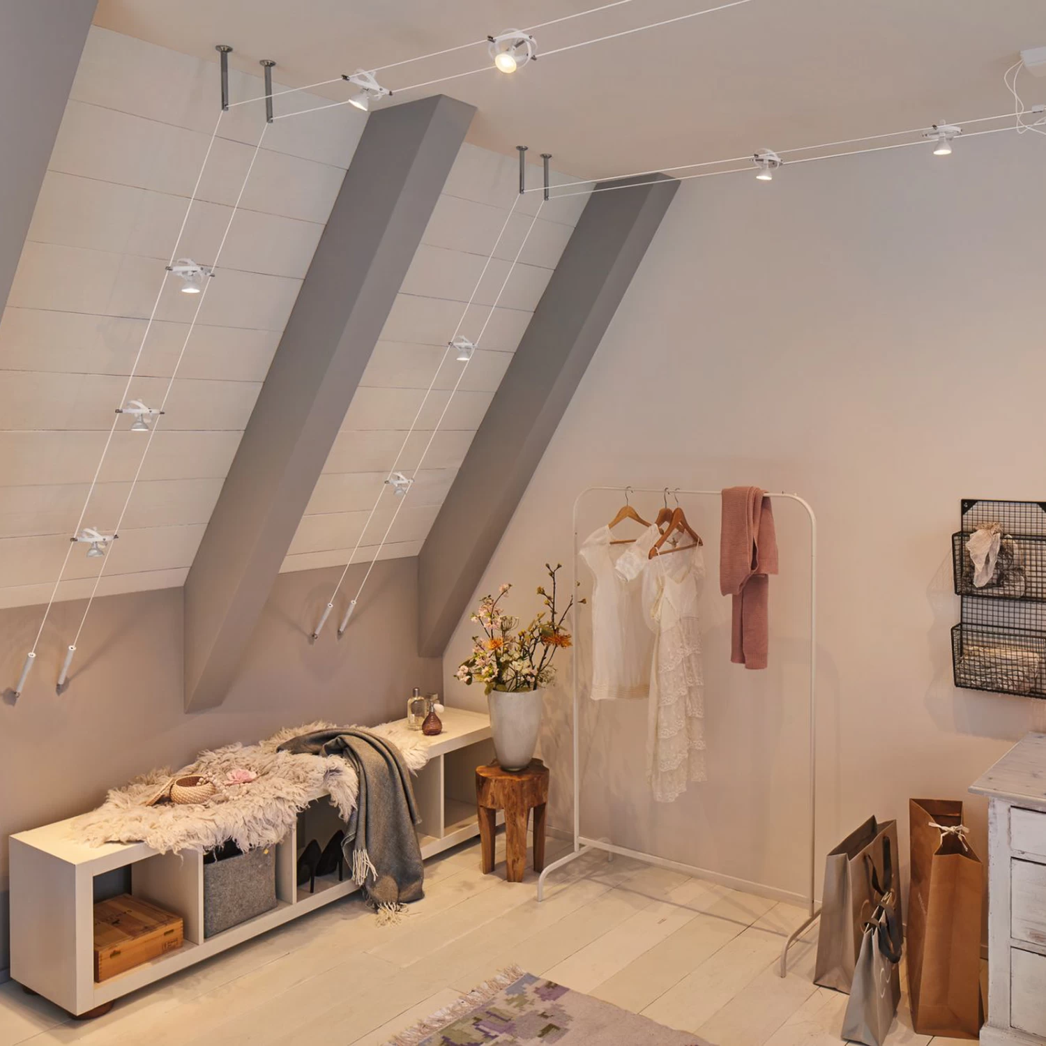 Grenzenlose Gestaltungsmöglichkeiten und eine Montagemöglichkeit an der Decke, einer Dachschräge oder an der Wand bietet das Seilsystem Cardan, das als Komplettset geliefert wird. Die acht Leuchten sind jeweils mit einer GU5,3-Fassung ausgestattet, die von zwei unterschiedlich großen, drehbaren Ringen umgeben wird. Die acht Leuchten können nicht nur am Seil beliebig positioniert werden, sie sind auch dreh- und schwenkbar, so dass sich die einzelnen Leuchten in unterschiedliche Raumbereiche ausrichten lassen und mit dem Seilsystem auch verwinkelte Räume oder lange Flure perfekt ausgeleuchtet werden können. Leuchtmittel werden nicht mitgeliefert.