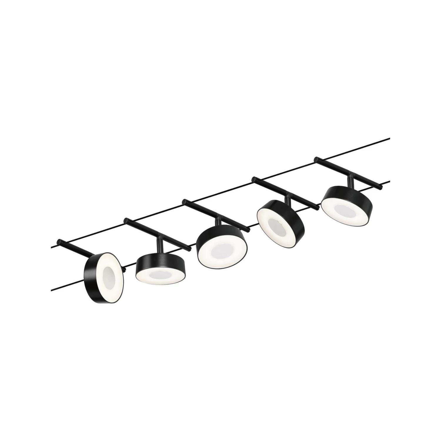 Circle ist ein LED-Seilsystem, das als anschlussfertiges Komplettset geliefert wird. Es besteht aus Seil, Trafo und fünf kreisrunden, flachen Leuchtenköpfen, die sich an den Halterungen schwenken lassen und in beliebiger Anordnung am Seil positioniert werden können, so dass auch größere oder verwinkelte Räume perfekt ausgeleuchtet werden können. Das System eignet sich sowohl zur Deckenmontage als auch zur Montage an der Wand oder an der Dachschräge. Die verbauten LEDs erzeugen ein warmweißes Licht und machen das System zu einer energieeffizienten Lichtquelle, die sich in vielen Räumen und Einrichtungsstilen anbringen lässt.