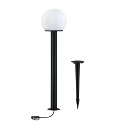 Ihr Gestell ist ein schlichter anthrazitschwarzer Zylinder aus Metall; gerade im Betrieb liegt der Fokus auf der oben angebrachten opalen Kugel, die mit einer E14-LED-Lampe bestückt ist. Sie erscheint als gleichmäßig leuchtende Sphäre und strahlt zu allen Seiten ein sanftes und gleichmäßiges Licht ab. Auch in losen Untergründen wie Grünflächen und Kiesabschnitten kann die Leuchte dank des mitgelieferten Erdspießes problemlos befestigt werden.