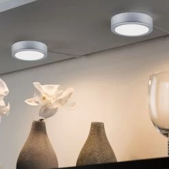 Die runden LED-Möbelleuchten lassen sich auf vielfältige Art befestigen: Sie können einfach angeklebt, angeschraubt oder auch eingebaut werden. Das Set besteht aus drei Leuchten und einem Vorschaltgerät. Zur Beleuchtung der Arbeitsfläche in der Küche oder zur Montage in Regalen oder Vitrinen, um Sammlerstücke effektvoll in Szene zu setzen – mit dem Leuchtenset Pukk ist vieles möglich. Die drei Leuchten strahlen dank integrierter LEDs ein energieeffizientes und angenehm warmweißes Licht ab. Zum Anschluss ist eine Steckdose in der Nähe des Vorschaltgerätes notwendig.