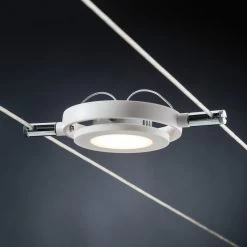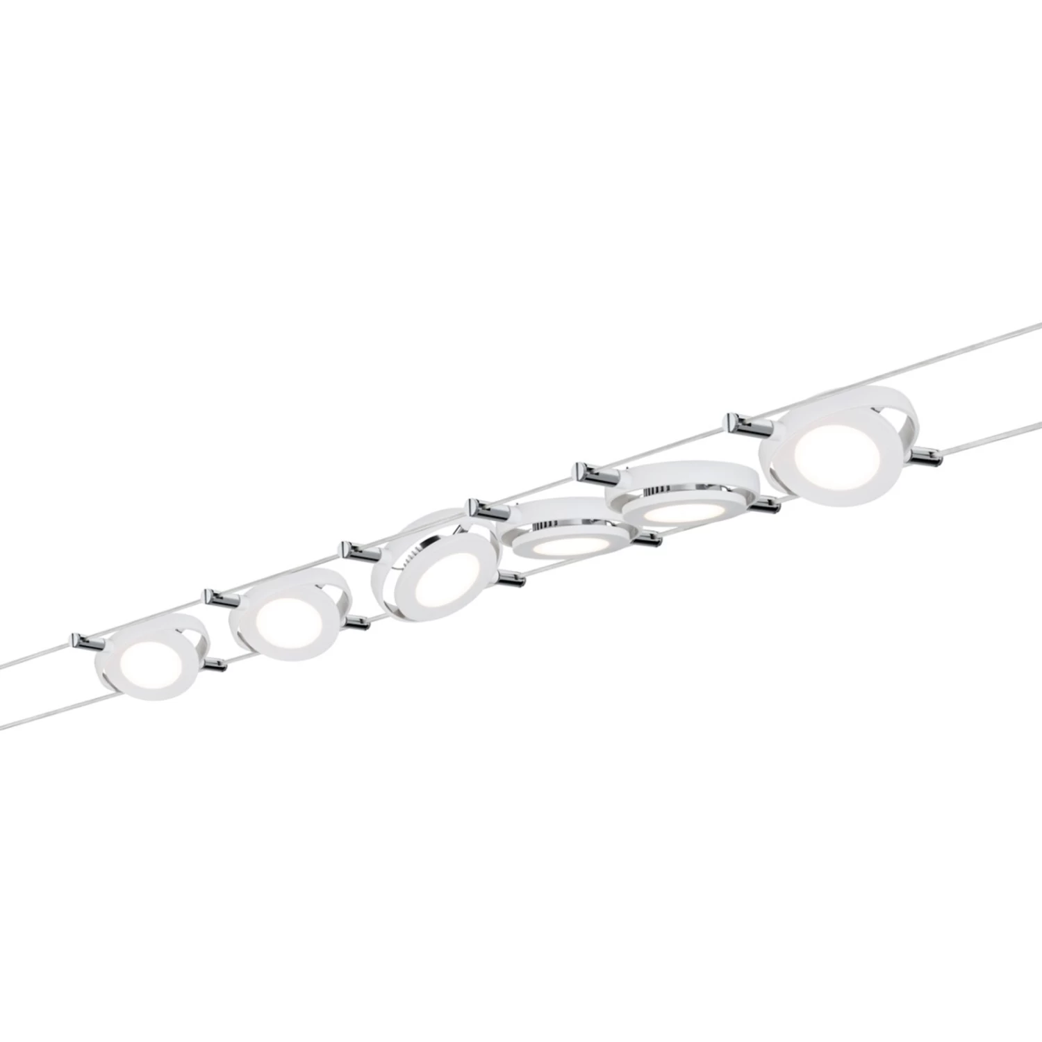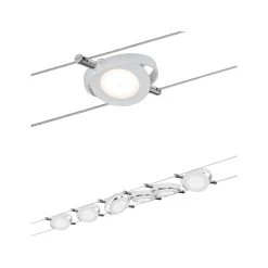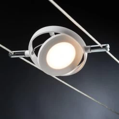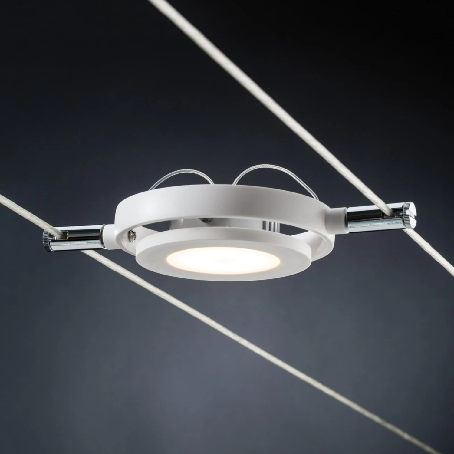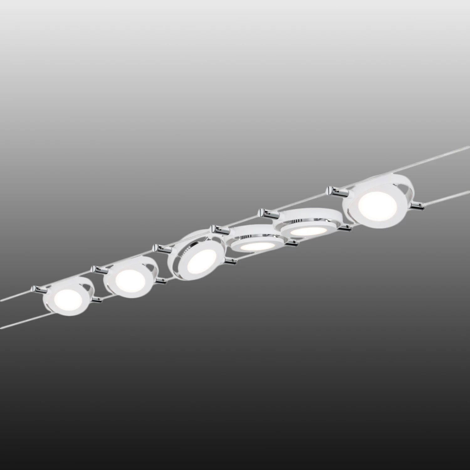 Ein stilvolles Seilsystem mit Seilen in einer Länge von rund 5 Metern erweist sich als praktisch für eine Montage in unterschiedlichen Räumen. Unter der Decke ist das System angenehm anzubringen. Entlang dem System sind kleine Spots aufzureihen. Diese sind entlang der parallelen Seile zu schieben. Dabei gibt es einen runden Rahmen, der ein Drehen der Spots innerhalb einer Achse erlaubt. Es gibt sechs Spots für dieses praktische System. Das Anbringen und Justieren der Spots erlaubt verschiedenste Lichtstimmungen im Raum, die sich auf einen Bereich konzentrieren oder das Licht über viele Bereiche des Raums hinweg verteilen. Die Beleuchtung erweist sich dabei als hell und doch auch behaglich, denn die Leuchten scheinen nicht zu grell im Raum.