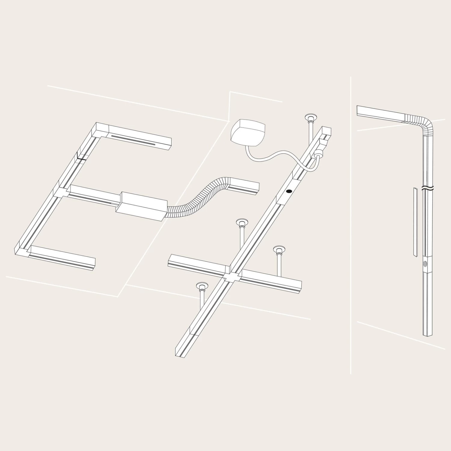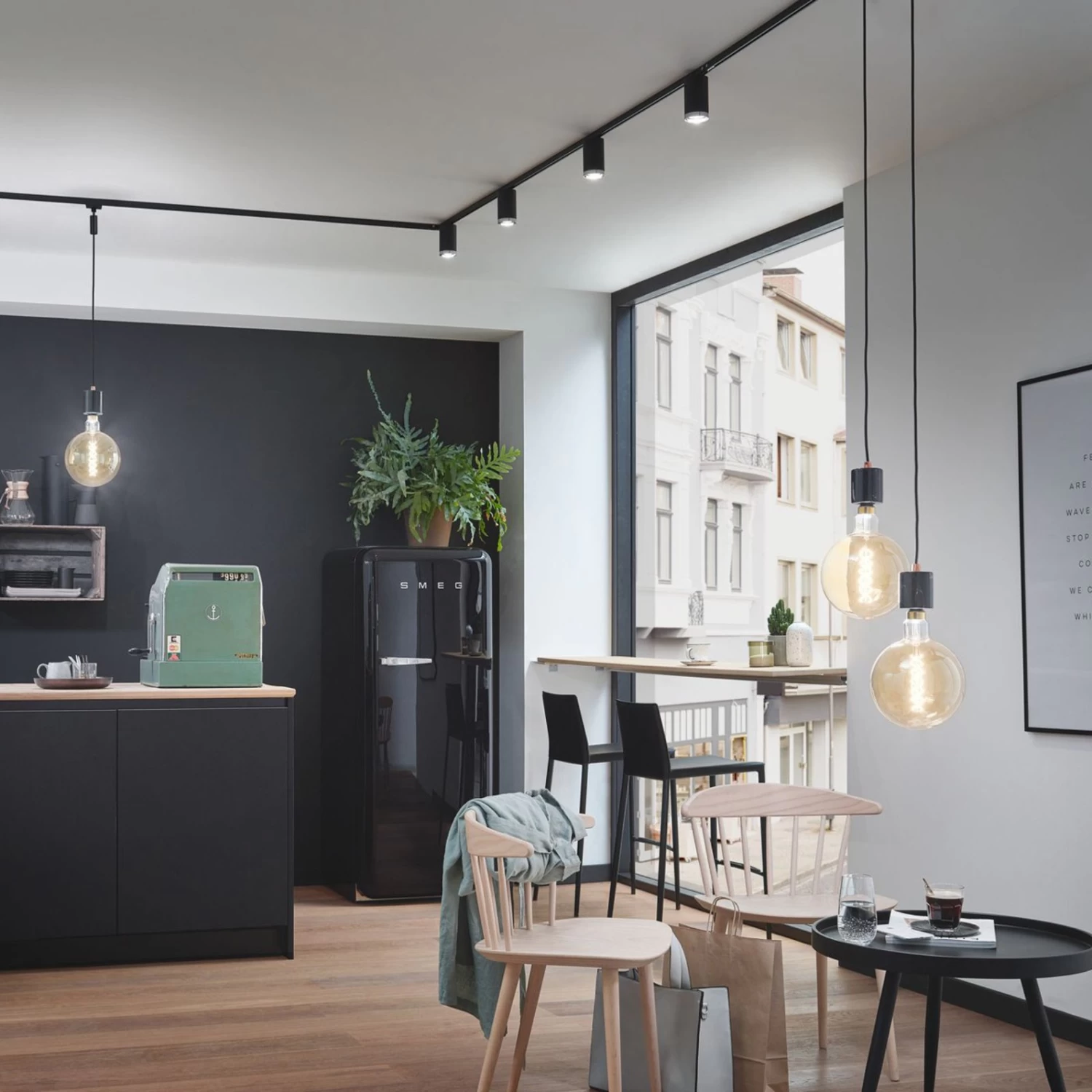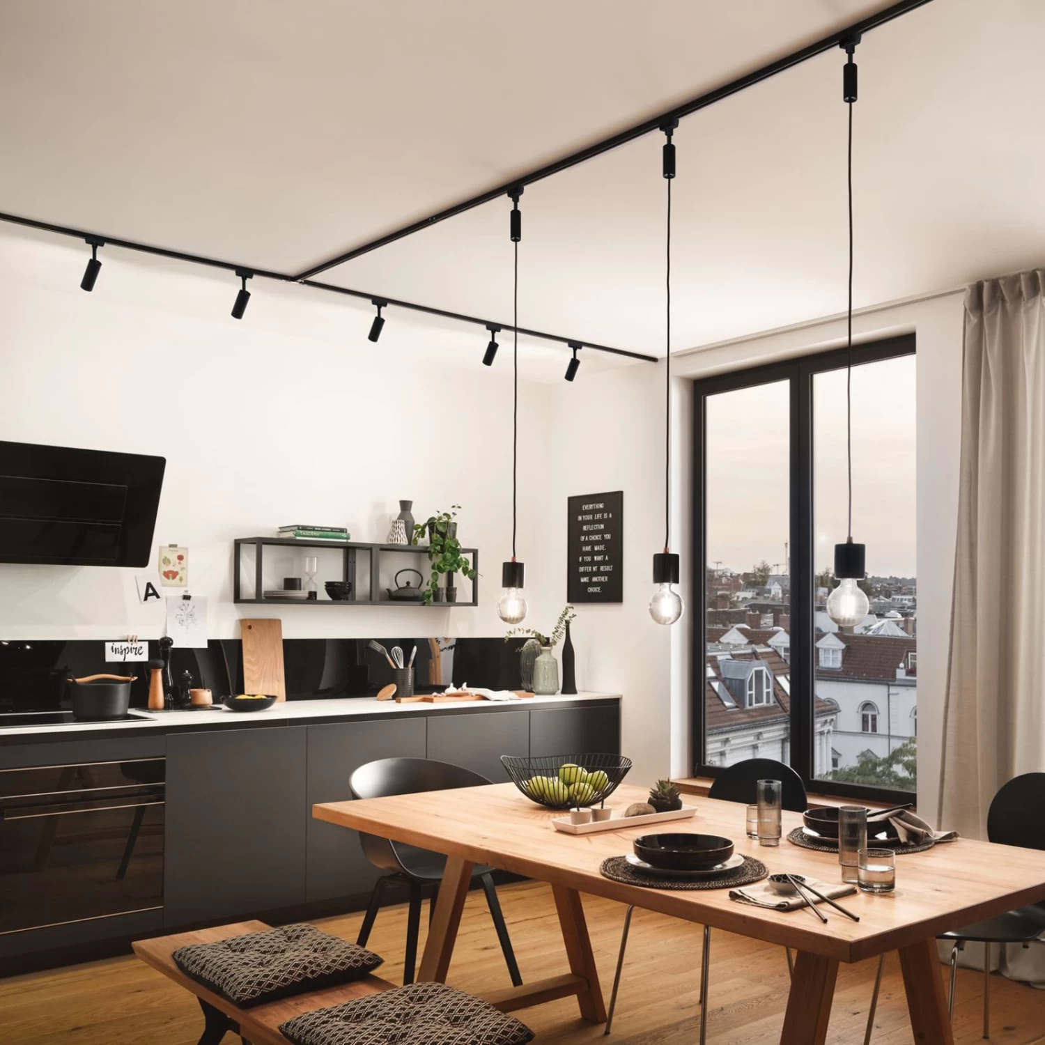 Die URail System Schiene sorgt für Kontraste an der Decke. Ihre schwarz matte, filigrane Ausführung bringt die Hochwertigkeit zum Ausdruck und kann sowohl in hellen als auch dunklen Einrichtungsstilen verwendet werden. Der Metallkörper lässt sich schnell und leicht anbringen.