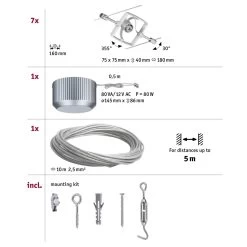 Als anschlussfertiges Komplettset wird das Seilsystem Wire Mac II geliefert. Es besteht aus einem 10 m langen Seil, sieben Leuchten mit GU5,3-Fassung, die sich beliebig am Seil positionieren lassen, einem Trafo sowie Montagematerial. Das Seilsystem bietet sich zur Beleuchtung großer Räume oder langer Flure an und kann nicht nur an der Decke, sondern auch an der Wand oder an der Dachschräge befestigt werden.