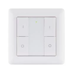 Der mitgelieferte Wandtaster kann ebenfalls zum Schalten und Dimmen verwendet werden. Er lässt sich wahlweise direkt mit den Leuchtmitteln koppeln oder smart einbinden, ist batteriebetrieben und passt in die Rahmen gängiger Markenschalter.