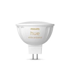 Mit dem smarten Philips Hue White Ambiance LED-Reflektor mit GU5,3 MR16-Sockel lassen sich herkömmliche Halogen-Leuchtmittel austauschen. Es können verschiedene Weißtöne von warmweiß (2.000 K) bis tageslicht (6.500 K) eingestellt werden. Darüber hinaus kann die Intensität des Lichtes stufenlos gedimmt werden.