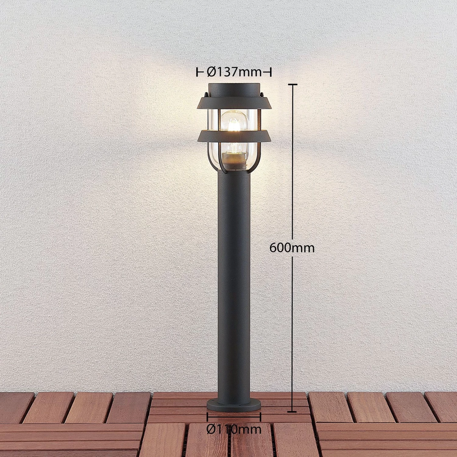 Alvaro ist eine Pollerleuchte, die Gartenwege und Einfahrten optimal erhellt, damit man sich auch dann noch gut orientieren kann, wenn sich der Tag bereits verabschiedet hat. Zwei ringförmige Elemente sind Bestandteil des Leuchtkopfes und dieses Design erinnert an den skandinavischen Stil, der auch bei Außenleuchten immer stilvoll erscheint. Dank des klaren Glaseinsatzes, der das Leuchtmittel schützt, ist der Blick auf die eingesetzte Lampe relativ frei, so dass man eines mit passender Optik auswählen sollte. Empfohlen werden können LED-Lampen mit Filament-Technik, die aussehen wie klassische Glühbirnen.