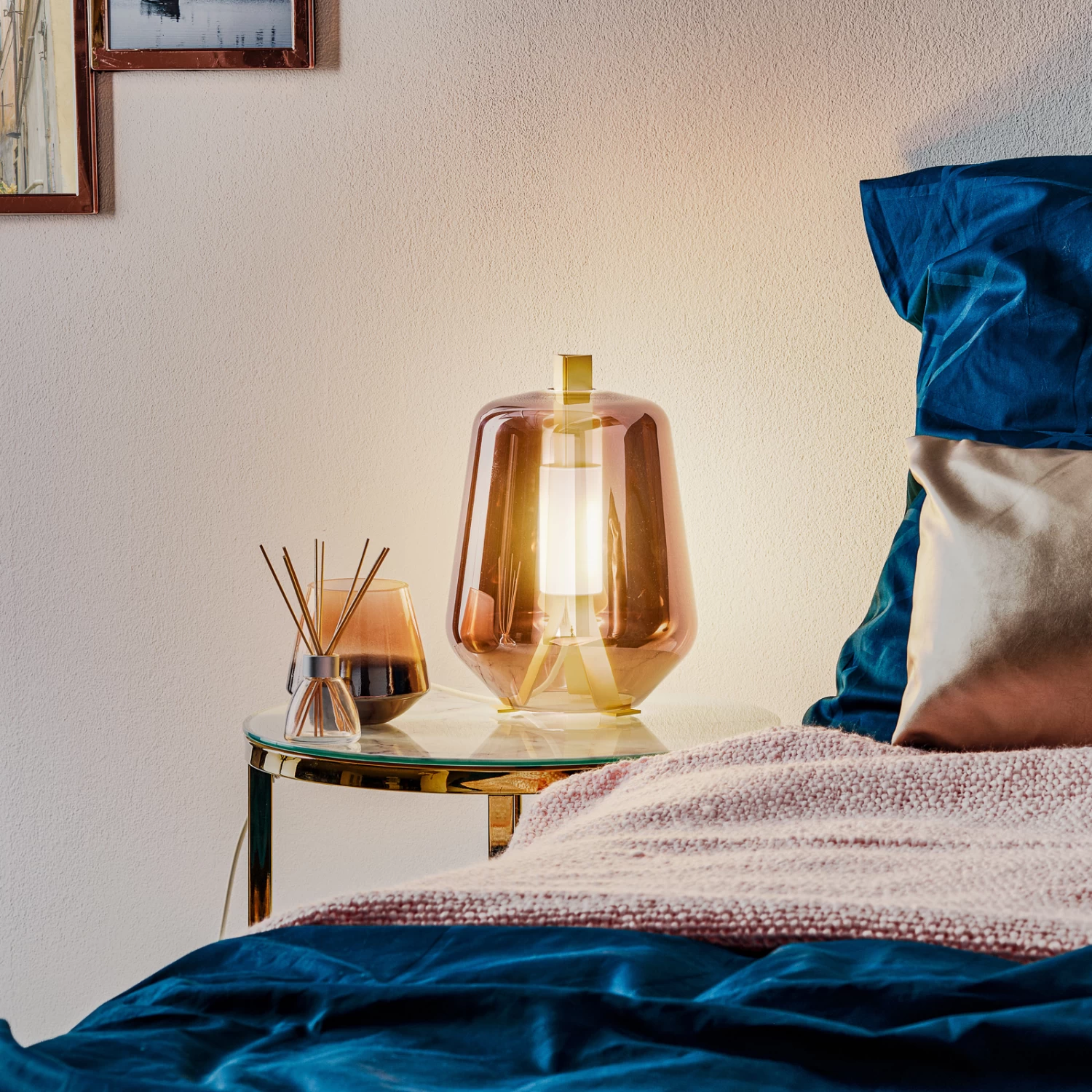 Edel und glanzvoll präsentiert sich die Tischleuchte Luisa durch die Kombination aus einem Metallgestell in Messing-Finish und einem mundgeblasenen Schirm aus Glas. Das Metallgestell zieht sich mittig durch den Glasschirm und endet unten in drei kleinen Füßen, die aus dem Schirm heraus blitzen und oben in einem Tragegriff, der ebenfalls aus dem Schirm heraus schaut. Warmweiße LEDs mit einer sehr behaglichen Lichtfarbe und einem besonders guten Farbwiedergabeindex von Ra >90 sitzen hinter den zylindrischen Diffusor in der Mitte des Schirms. Der satinierte Diffusor lässt das Licht sehr gleichmäßig strahlen. Luisa T1 ist eine glanzvolle Tischleuchte für Wohnräume, aber auch für den Nachttisch im Schlafzimmer oder auch im Hotel.