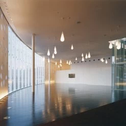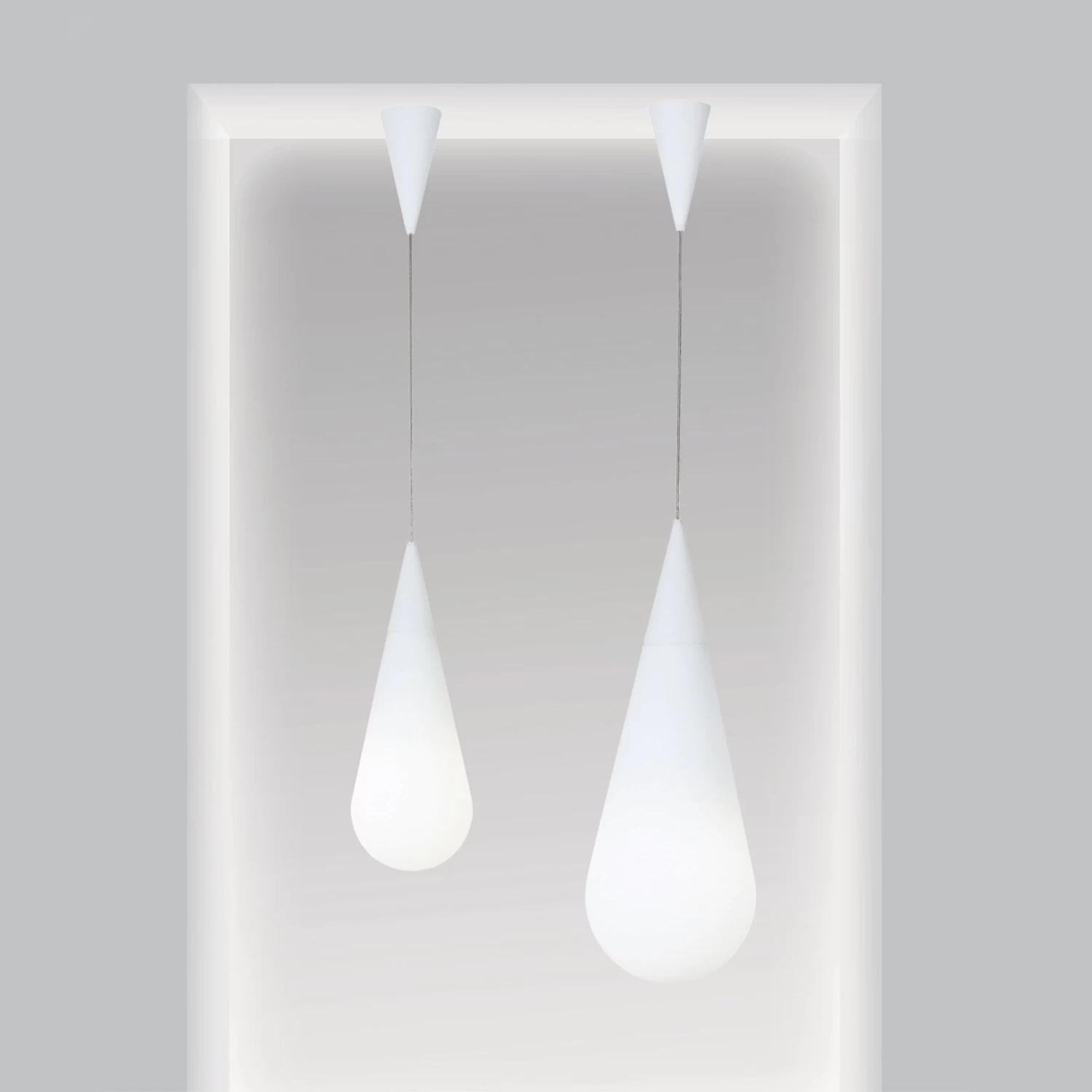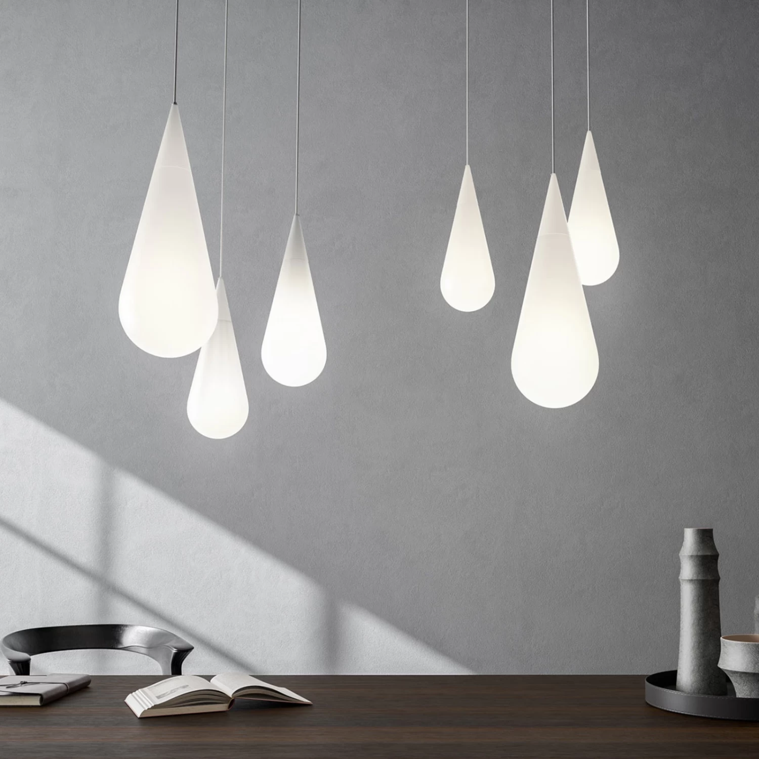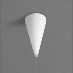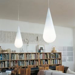 Die Form der Leuchte ähnelt einem Tropfen oder erinnert an einen Schmuckanhänger und ist dabei ebenso schlicht wie edel. Zwei aufeinanderliegende Opalglaselemente verbinden sich zu einem Stück, in dessen Inneren sich das Leuchtmittel befindet. Der obere kegelförmige Teil bildet sich spiegelverkehrt auch in der Deckenaufhängung ab. GOCCIA besitzt dank der weichen Form eine ganz eigene Ausstrahlung und kann einzeln genauso wie in einer Gruppe von Leuchten – wobei hier der Kreativität bezüglich der Anordnung keine Grenzen gesetzt sind – zum Einsatz kommen.