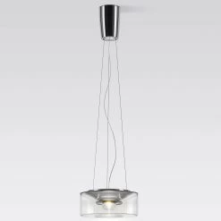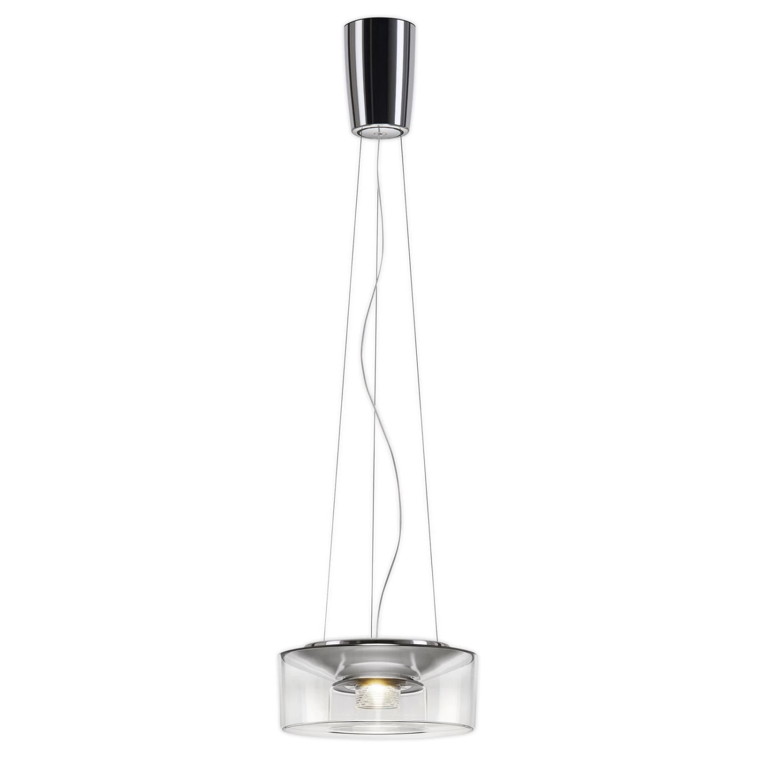 Curling ist eine LED-Pendelleuchte, bei der sich eine zeitlos-elegante Form und fortschrittliche LED-Technik zu einem stimmigen Lichtspender vereinen. Der transparente Schirm in flacher Zylinderform besteht aus Acryl und beherbergt eine LED-Lichtquelle mit poliertem Aluminiumgehäuse, deren Licht die Farben der erhellten Gegenstände natürlich darstellt. Ein magnetisch befestigter optischer Einsatz mit speziellem Schliff sorgt für eine sanfte, direkte Lichtabgabe nach unten. Schlanke Stahlseile dienen zur Befestigung am Baldachin aus glänzendem Aluminium. Das Einsatzgebiet der Leuchte reicht von privaten Wohnräumen über gastronomische Objekte bis hin zu Eingangs- und Empfangsräumen.