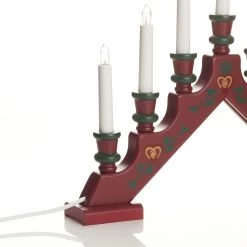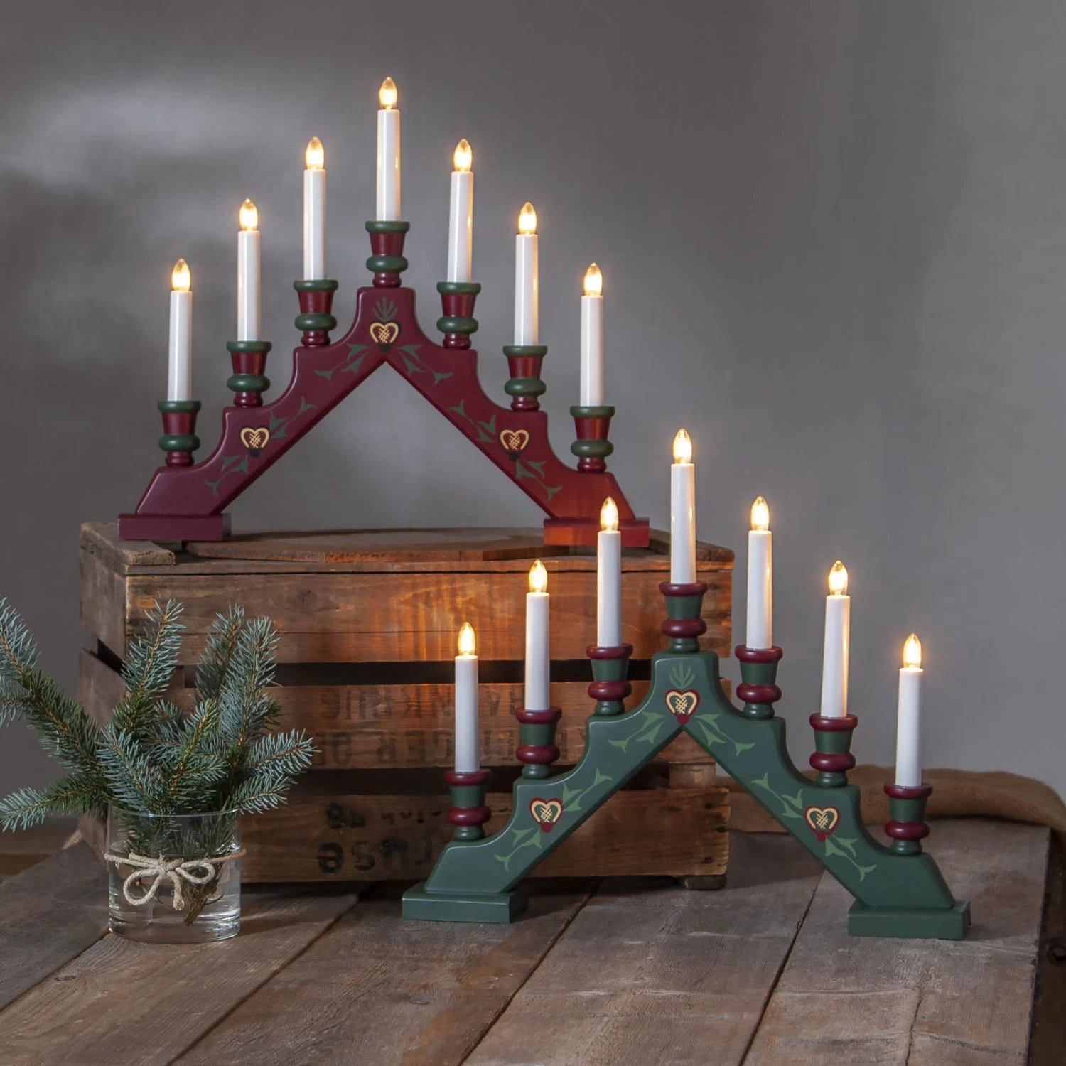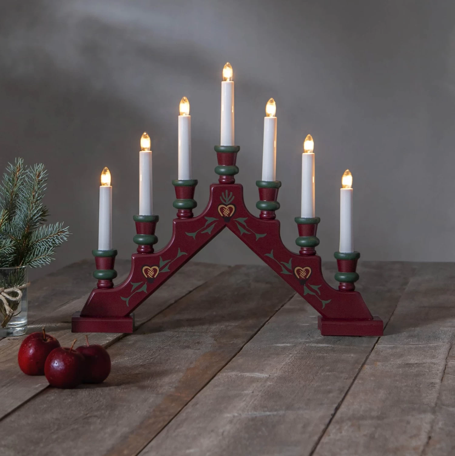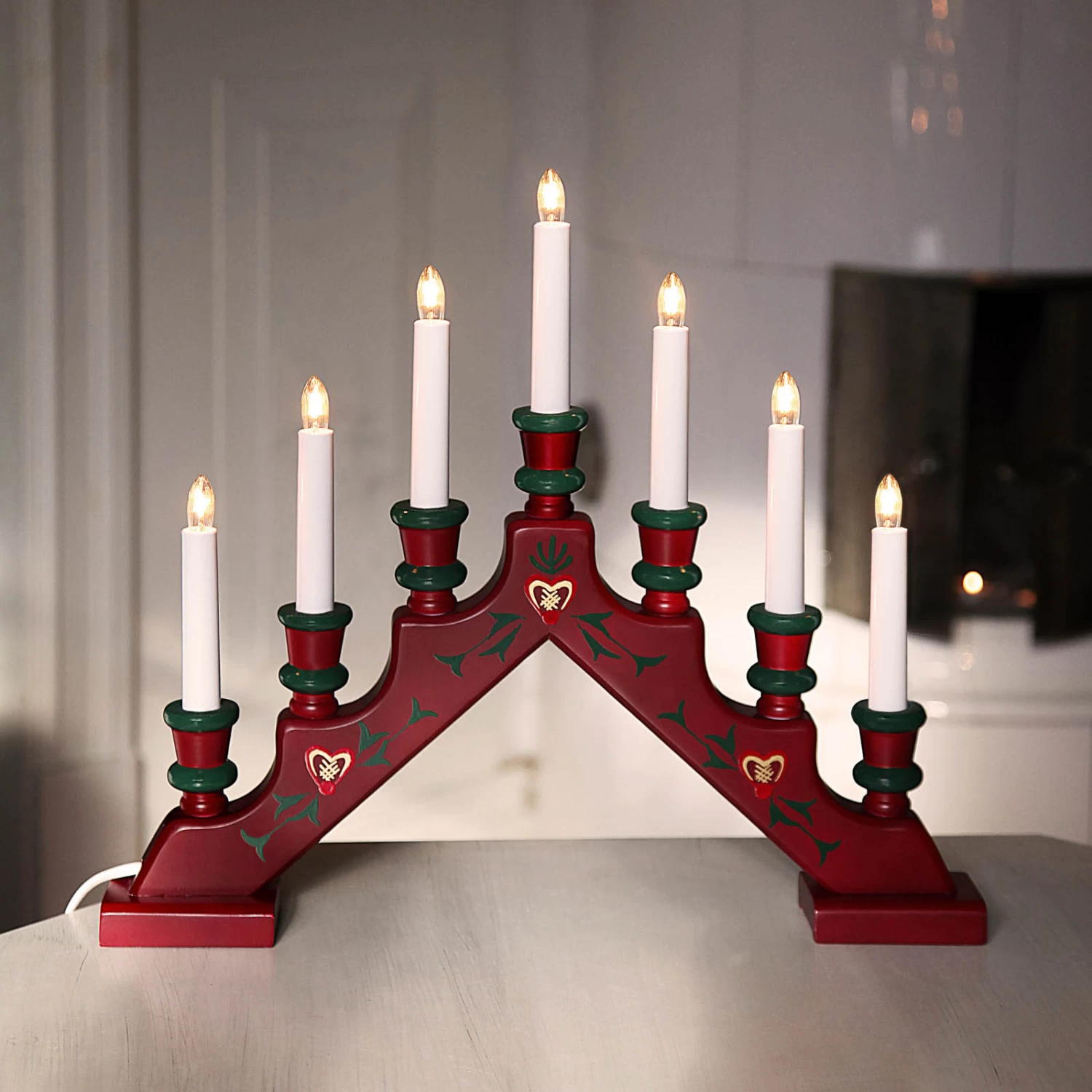Mit einem Lichterbogen wie dem Lichterbogen Sara Tradition kann man in Sachen Weihnachtsdekoration nicht falsch liegen. Der Lichterbogen besteht aus einem klassisch roten Gestell mit zartem Muster und weißen Kerzen obenauf.