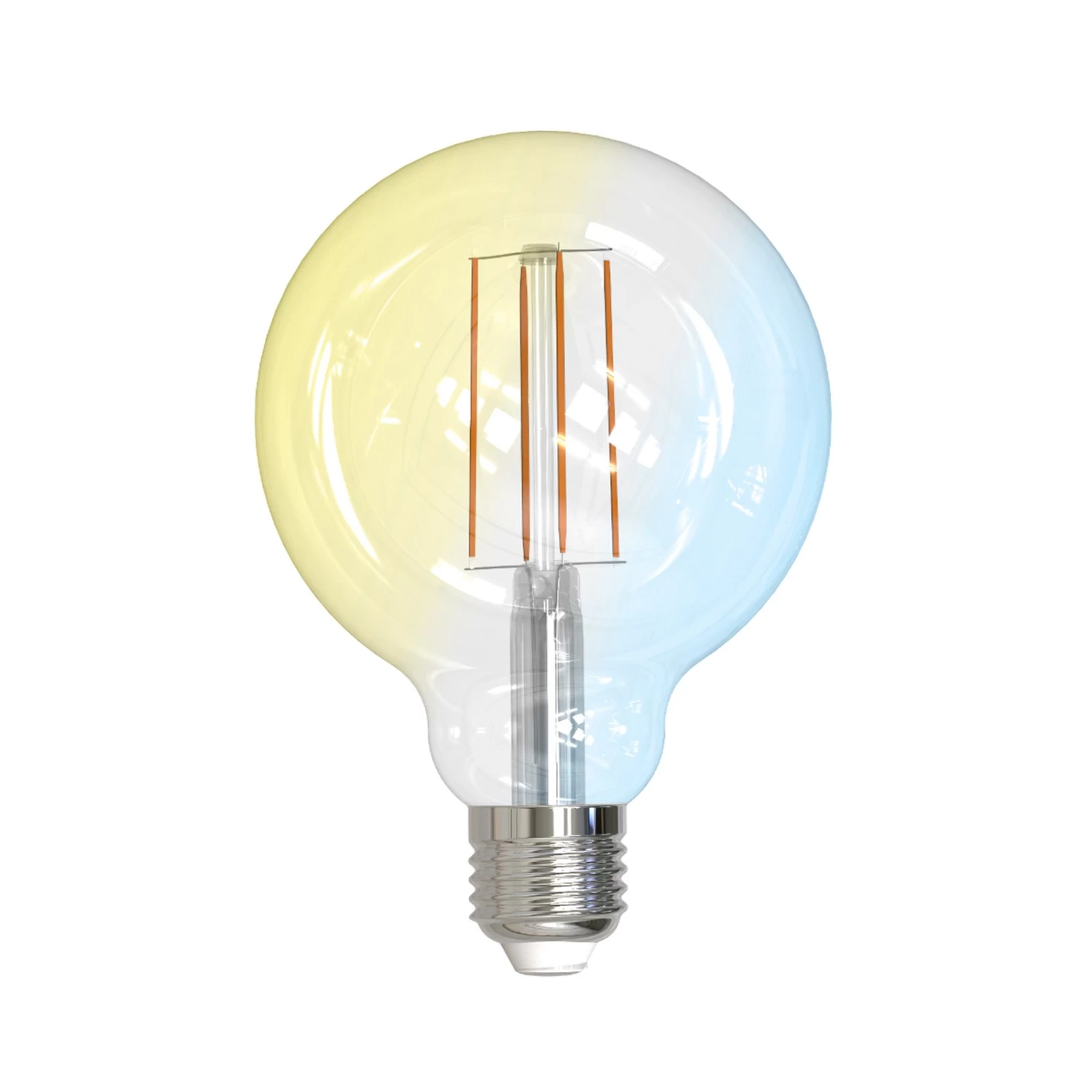 Dieses Filament-Leuchtmittel ist für E27-Fassungen geeignet und lässt sich einfach mit ZigBee, Tuya oder Philips Hue steuern und in ein kompatibles Smart Home System integrieren. Es verfügt über eine CCT-Funktion und kann eine Lichtfarbe von warmweiß (2.700 K) bis tageslicht (6.500 K) generieren. Auch per Sprachsteuerung bedienbar (Amazon Alexa oder Google Assistant).
