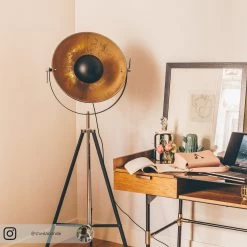 Mineva passt super zu jungen Wohnstilen, aber auch zu solchen Einrichtungen, die von einem industriellen Stil dominiert werden. Die Stehleuchte besitzt ein dreibeiniges Stativ, das der Leuchte sicheren Halt gewährt und Assoziationen wachruft an die Welt der Fotografie, wo man auch ähnlichen Scheinwerfern begegnet. Direkt über dem Leuchtmittel sitzt eine schwarze Kuppel, die bewirkt, dass der Lichtschein – unabhängig von der Ausrichtung des Schirms – nur indirekt austreten kann. Zudem bewirkt die mattgoldene Schirminnenseite absolute warme Lichtreflexionen, so dass man sich im Schein der schwarzen Stehleuchte Mineva entspannt zurücklehnen und den angebrochenen Abend auf behagliche Weise genießen kann.