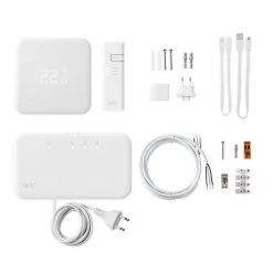 – Lieferumfang: tado° Funk-Temperatursensor, tado° Funk-Empfänger, tado° Internet-Bridge, 3 AAA Batterien, 2 x 2 Wandontageschrauben, 2 x 2 Dübel, 2 Klebepads, 3-adriges Kabel, 2 Isolatoren, USB-Kabel, Netzadapter, USB-Stromversorgung, USB-Kabel, Ethernet-Kabel, Handbücher und Setup-Anleitung