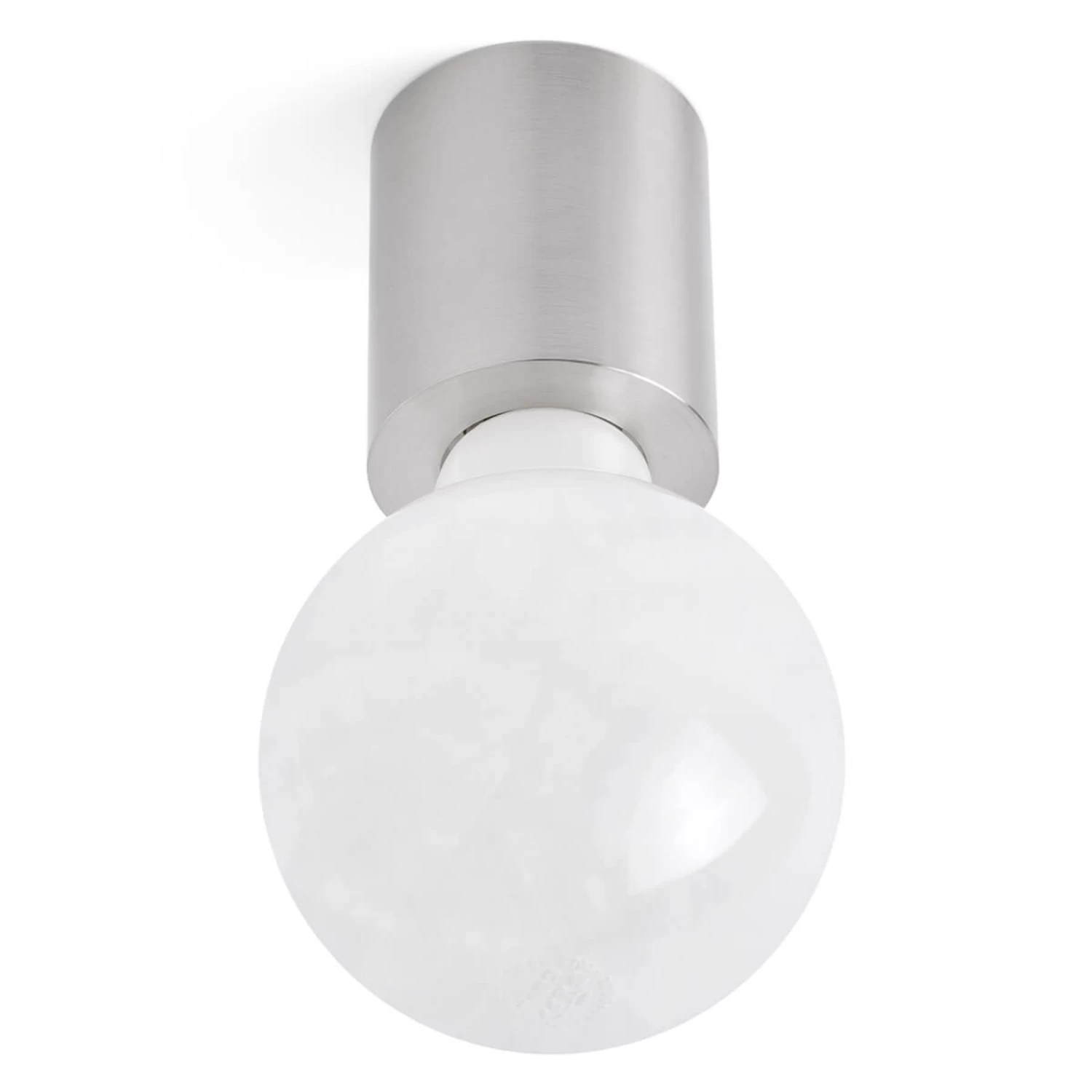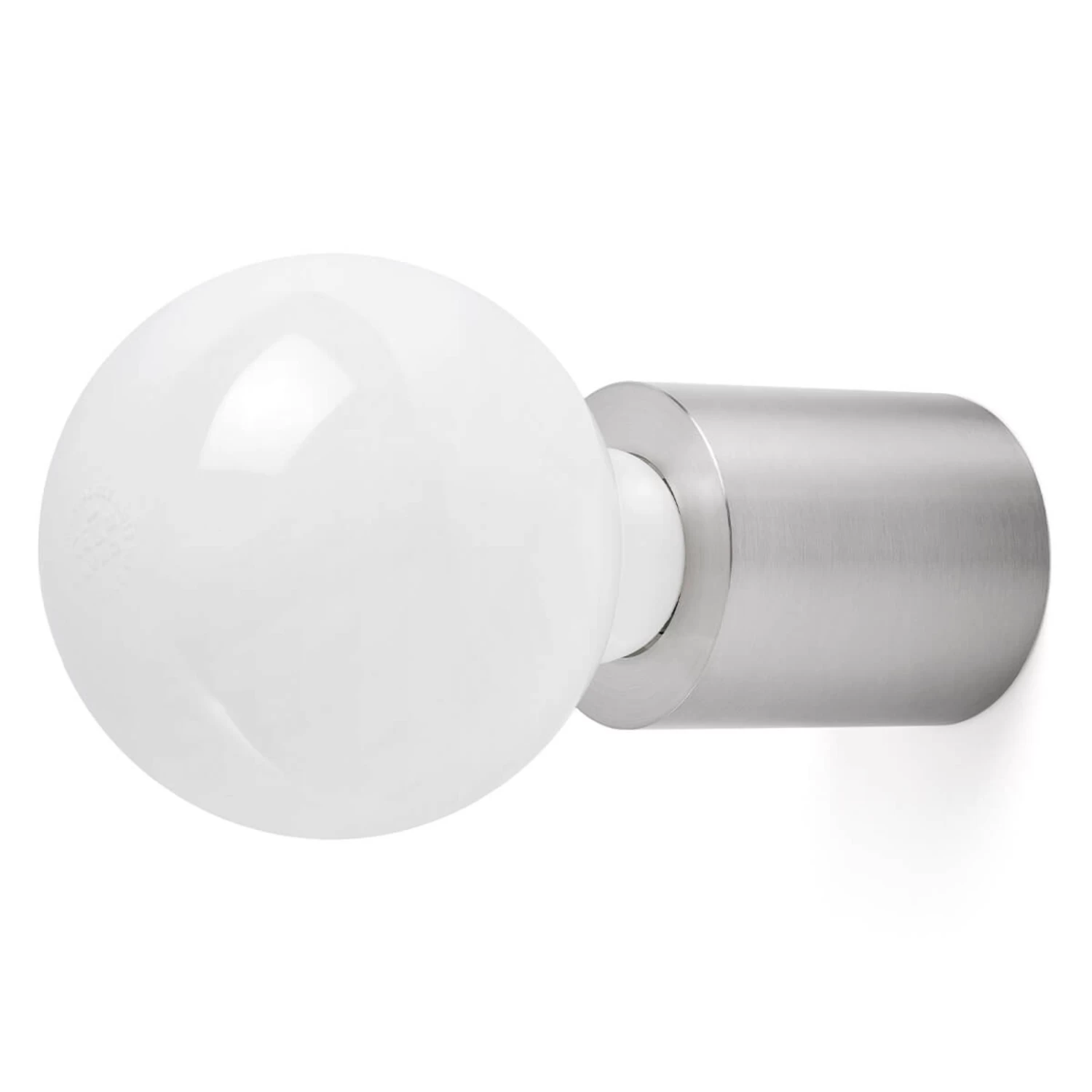 Eine schlichte Fassung aus Metall, in die ein Leuchtmittel mit E27-Fassung eingesetzt wird – das ist die Wandleuchte Ten, die durch die Wahl des Leuchtmittels optisch verändert werden kann. Wie auf dem Foto kann eine Globelampe mit klarem Glas eingesetzt werden, aber auch LED-Lampen mit satinierter Oberfläche sind möglich oder auch Leuchtmittel in anderen Formen (siehe Zubehör). In kleinen Räumen oder zu mehreren montiert, kann die Leuchte auch als Deckenlampe Verwendung finden.