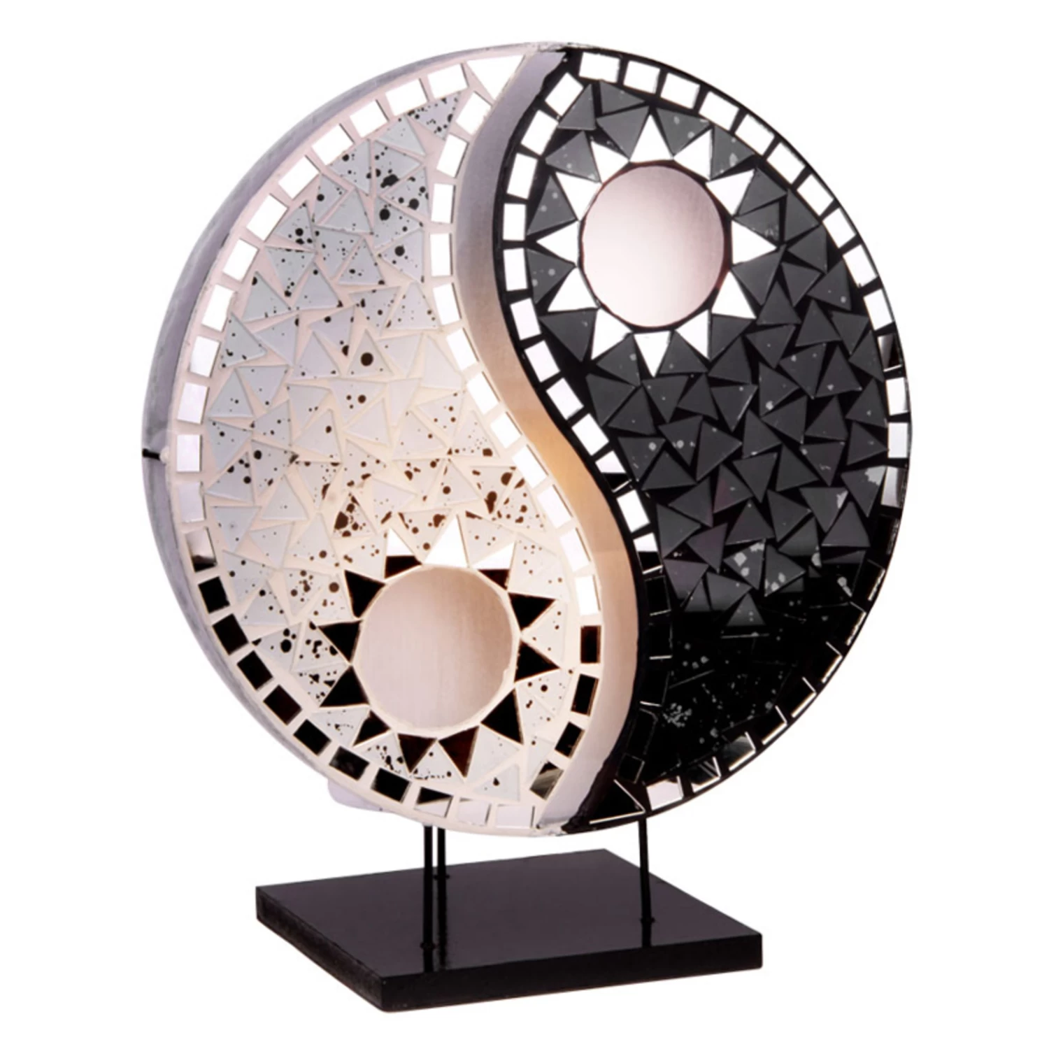 Rundlich geformte, schwarz-weiße Tischleuchte Ying Yang mit Spiegelstücken