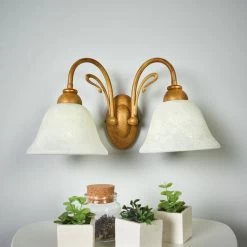Die zweiflammige Wandleuchte Antonio aus italienischer Herstellung überzeugt durch ihr hochwertiges, elegantes Erscheinungsbild. Die Wandleuchte besitzt zwei cremefarbene Lampenschirme aus Scavoglas, welche für eine warmweiche Beleuchtung sorgen. Gehalten werden die Schirme von einem Metallgestell in antikem Design.