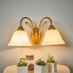 Die zweiflammige Wandleuchte Antonio aus italienischer Herstellung überzeugt durch ihr hochwertiges, elegantes Erscheinungsbild. Die Wandleuchte besitzt zwei cremefarbene Lampenschirme aus Scavoglas, welche für eine warmweiche Beleuchtung sorgen. Gehalten werden die Schirme von einem Metallgestell in antikem Design.
