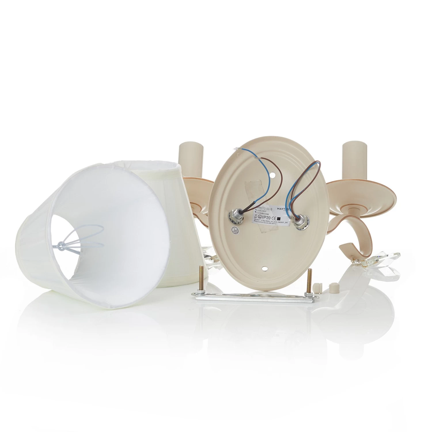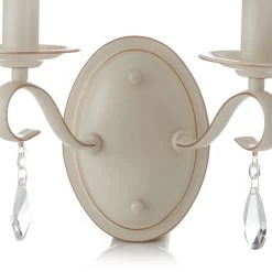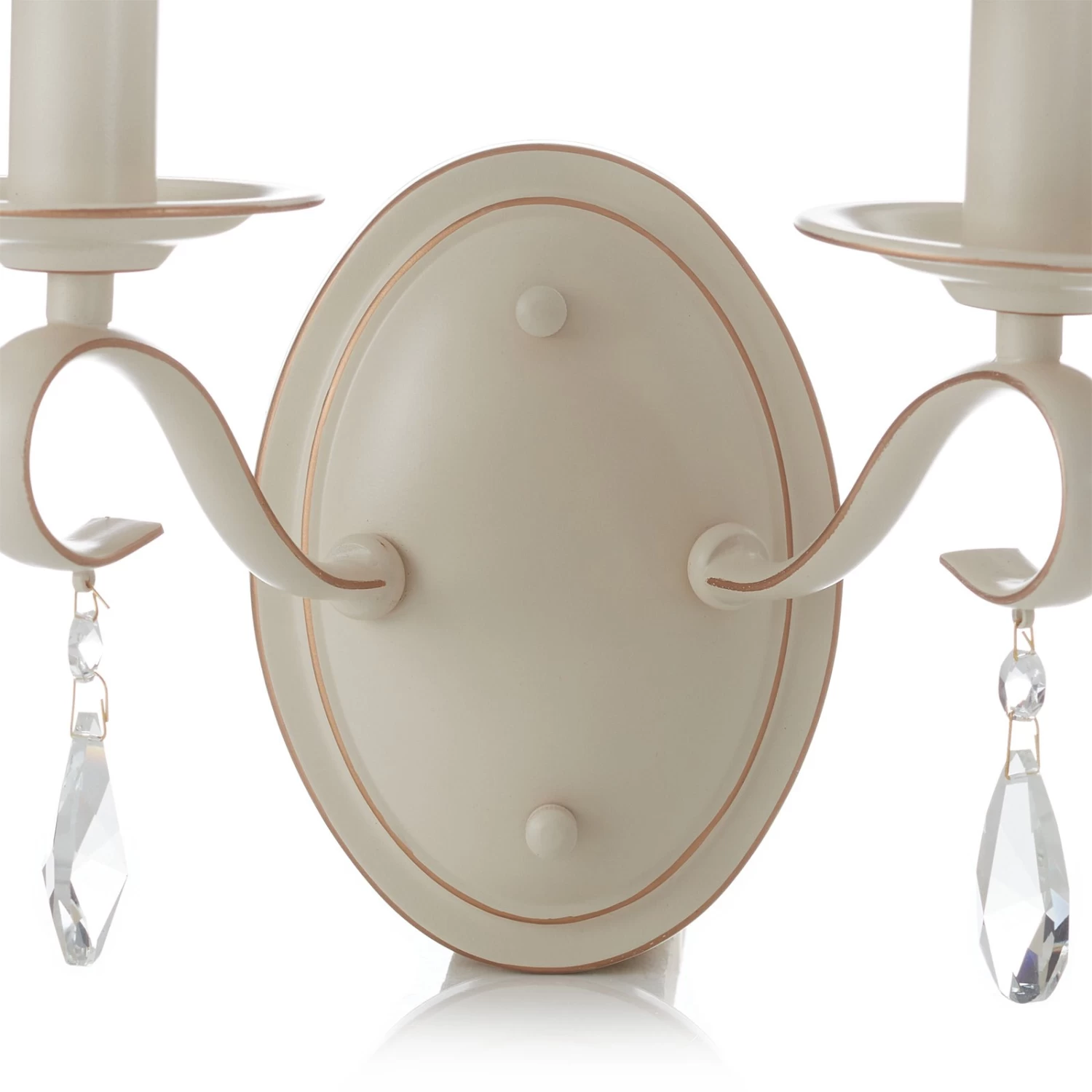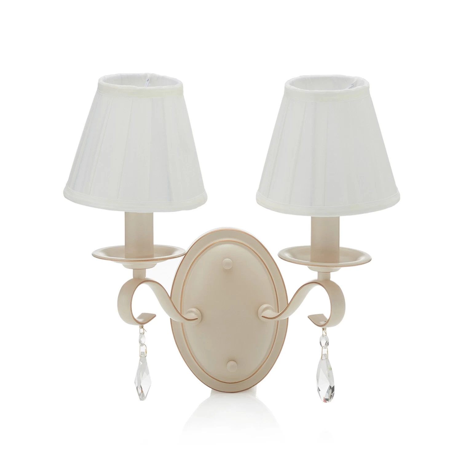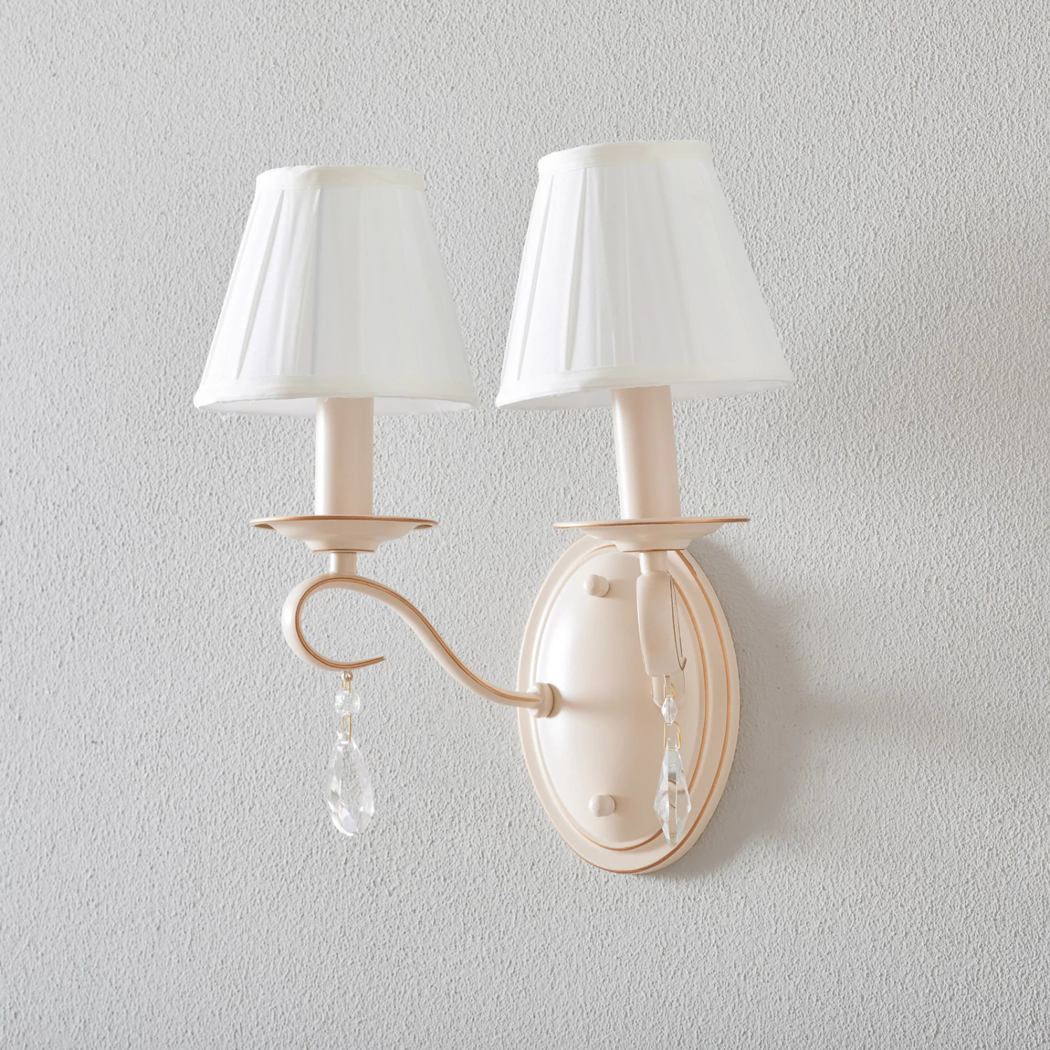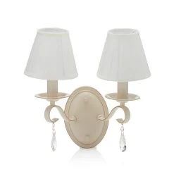 Die verspielte, aber höchst dekorative Wandleuchte Brionia besitzt zwei kleine Lampenschirme. Diese sind aus plissiertem Satin gefertigt und sorgen für einen sanften, gleichmäßigen Lichtschein. Der Leuchtenkörper ist aus Metall und leicht verschnörkelt gestaltet. An beiden Leuchtenarmen ist jeweils ein kleiner Kristallbehang angebracht, was die verspielte Note zusätzlich hervorhebt. Für alle Wohnräume, in denen eine elegante, stilvolle sowie verspielte Zusatzbeleuchtung benötigt wird, bietet sich die Wandleuchte Brionia an. Mit ihrem cremeweißen Farbton fügt sie sich zudem in fast jede Einrichtung spielend leicht ein.