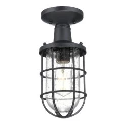 Das widerstandsfähige Gehäuse der Außendeckenleuchte Crestview besteht aus Stahl mit einer strukturierten Oberfläche in Schwarz und hat die Form eines Käfigs. Innen sitzt ein Lampenschirm aus Glas mit feinen Lufteinschlüssen. Das Antikglas erzeugt ein leicht diffuses Licht und ist aus der Nähe auch sehr schön anzuschauen, wenn diese Deckenleuchte gerade nicht eingeschaltet ist.
