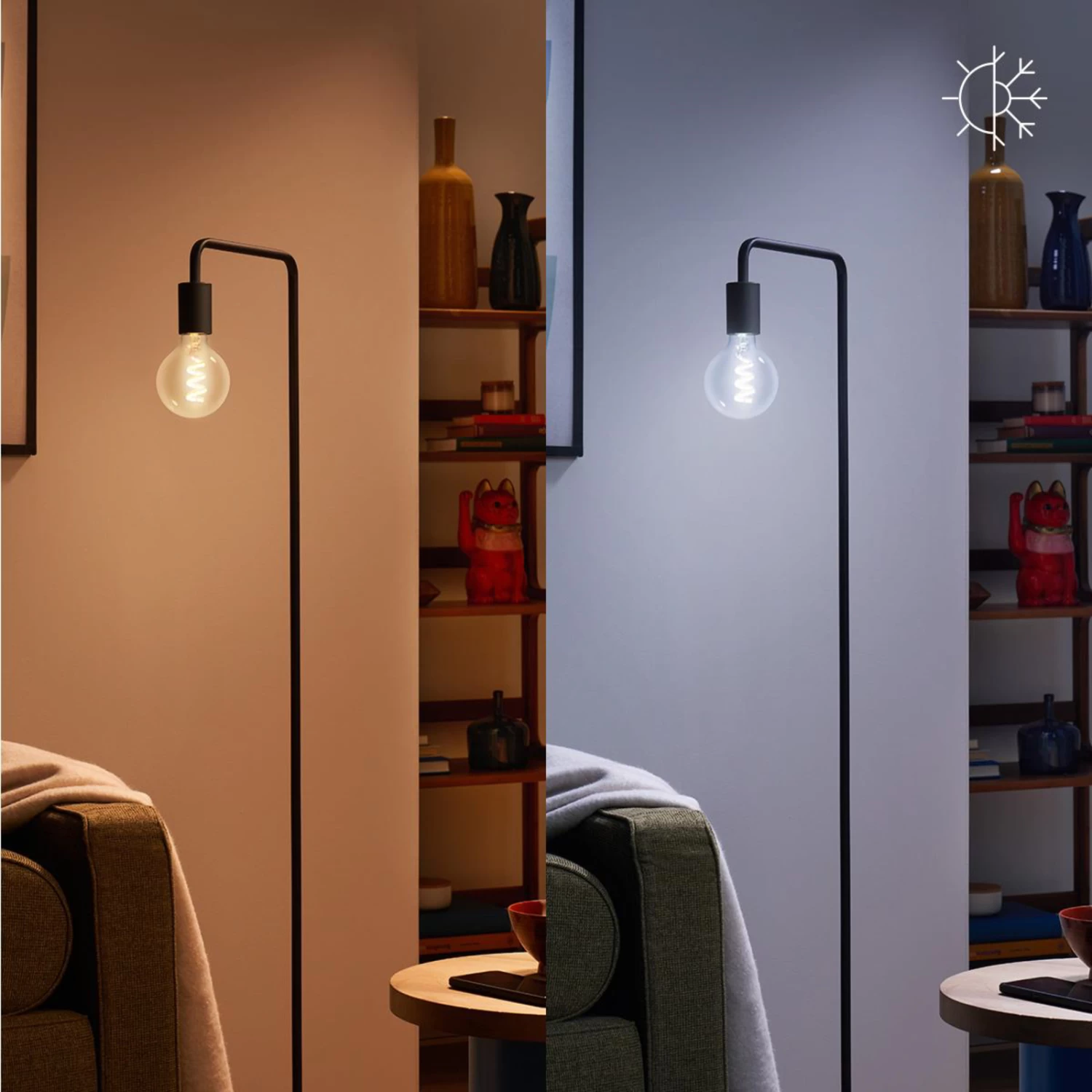 Gerade herkömmliche Leuchten, die einen Blick auf die Fassung gewähren, lassen sich mit dieser LED-Lampe optisch ansprechend smart aufrüsten. Das Leuchtmittel in klarer Globeform G95 ist mit LED-Filamenten ausgestattet, die warmweißes bis tageslichtweißes Licht und dazu zahllose bunte Abstufungen bei dimmbarer Helligkeit ermöglichen. Diese können frei nach Wunsch abgestimmt oder in Form vorkonfigurierter Szenen ausgewählt werden. Alle Einstellungen lassen sich per App auf dem Tablet/Smartphone vornehmen, zudem bestehen Optionen zur Steuerung per Fernbedienung, Sprachbefehl und Smart Home Systeme.