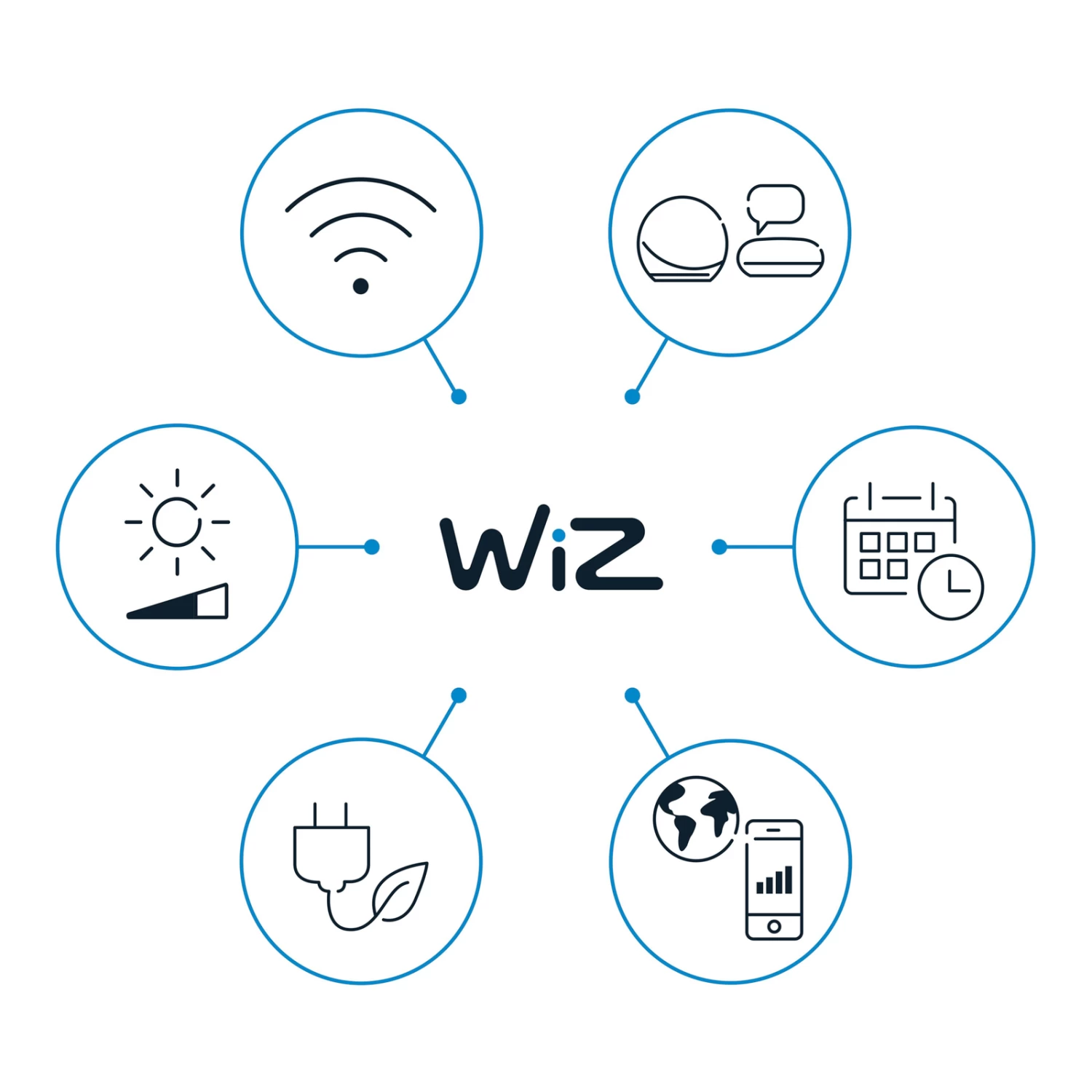 – versch. App-Funktionen: direktes Schalten und Dimmen; Speichern beliebter Szenen; Zuweisung der Leuchtmittel zu Räumen/Gruppen; Erstellung von Zeitplänen; Auswahl voreingestellter Lichtmodi/Szenen; Zuweisung mehrerer Nutzer und Vergabe von Zugriffsrechten; Bedienung von bis zu 10.000 WiZ-Leuchtmitteln